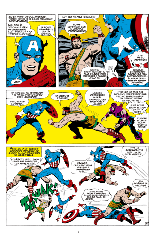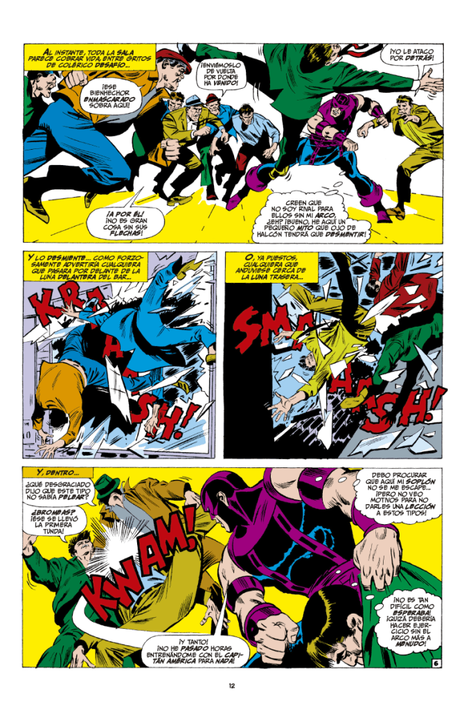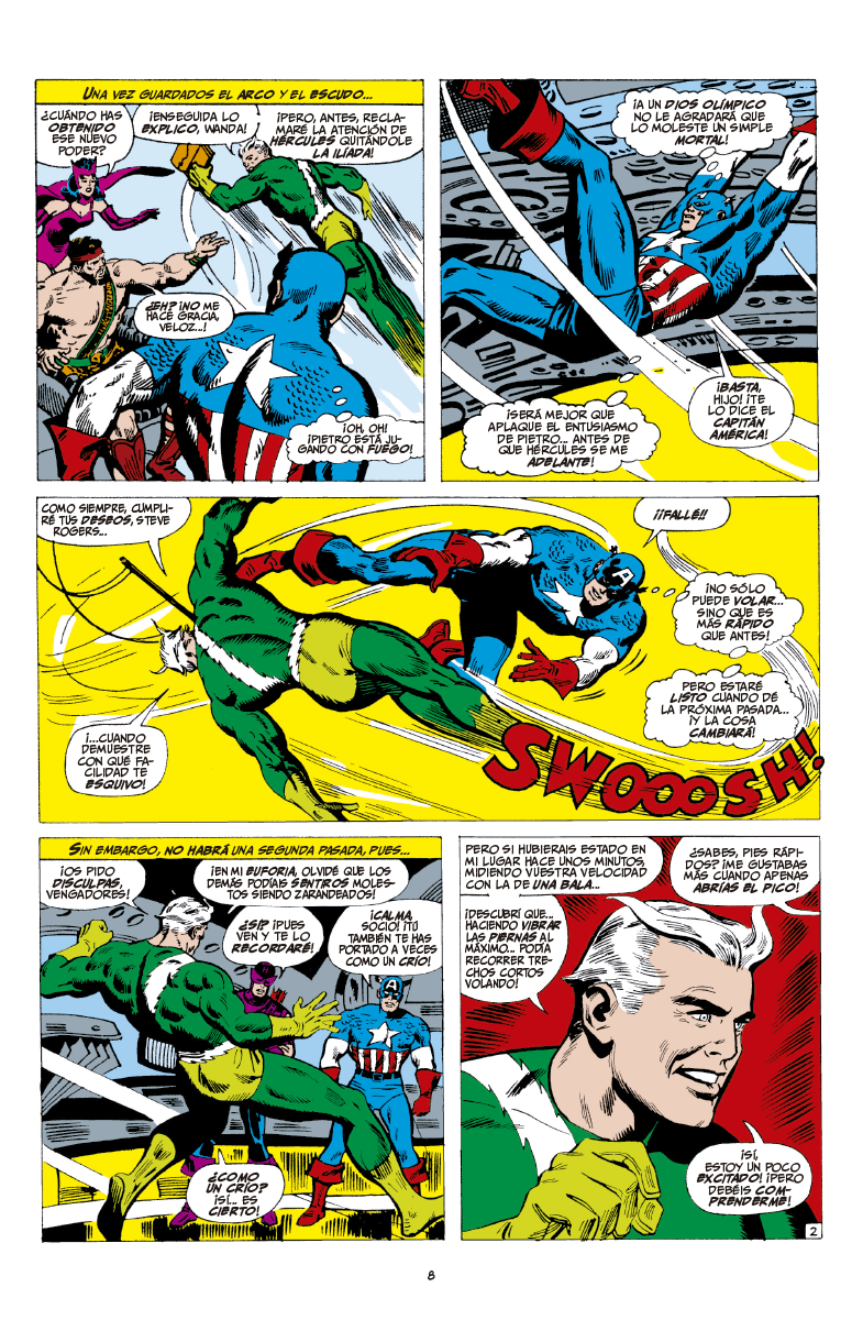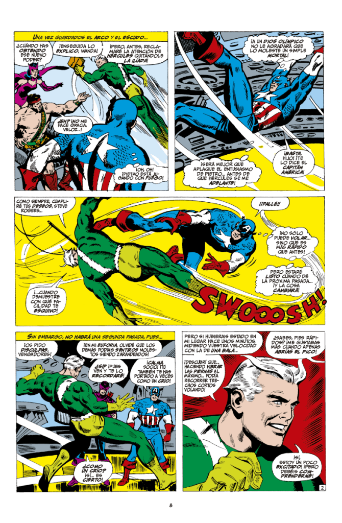 Aparte de unas batallas estupendas, lo que más me gusta del guion de Roy Thomas es que los personajes por fin se comportan como héroes, olvidándose de los desplantes verbales y la mala educación que sufrimos con muchos diálogos de Stan Lee. Tener a héroes comportándose como tal me gusta, y es un cambio en la buena dirección que espero sea la norma a partir de ahora. Siguen habiendo pequeñas chorraditas en la historia, como que Mercurio pueda volar durante cortos periodos de tiempo cuando corre a máxima velocidad. Estos detalles no son importantes y no me molestaron durante la lectura.
