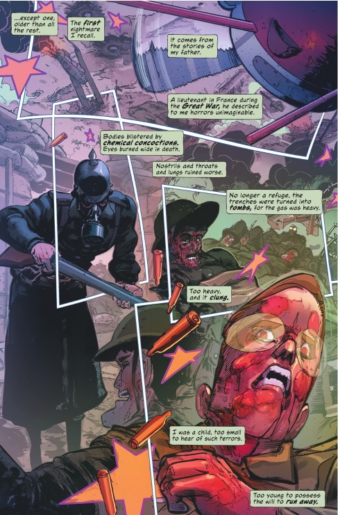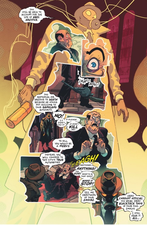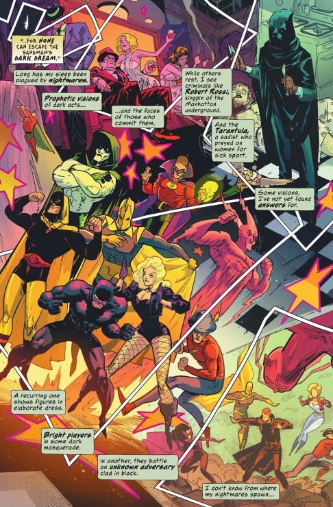 Empezando por la historia de Robert Vendetti, el escritor se muestra continuista respecto al icónico comic del sello Vertigo. La narración en primera persona en el que Wesley Dodds nos cuenta sus sentimientos y el contenido de sus pesadillas que le impulsar a luchar contra el crimen plantea una narración conocida que lleva la historia a un lugar familiar. Al tener 6 números en lugar de los clásicos arcos de 4 grapas de Sandman Mistery Theatre, la historia puede ser un poco más compleja y no tiene que ir al grano en la forma en que lo hacía el comic de Vertigo, lo cual es muy de agradecer. Dicho esto, los giros sobre la identidad de los villanos que roban la libreta de Wesley con todas sus investigaciones son un poco evidentes, pero no es un problema para el disfrute del comic.