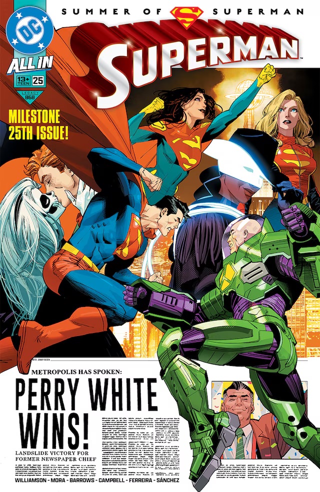 Estoy disfrutando un montón la actual colección de Superman escrita por Joshua Willaimson. Y el número 25 es un especial con dibujo de Jamal Campbell, Eddy Barrows, Eber Ferreira y Dan Mora que sirve de culminación a varias de las tramas abiertas desde el principio de esta etapa.