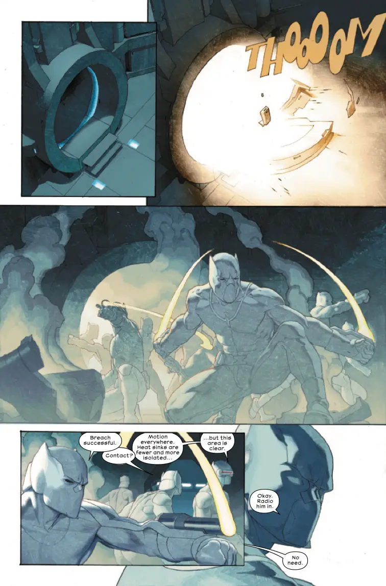 Dejando a un lado este detalle, es muy llamativo el tono nihilista y sin esperanza de Hickman. Incluso con la llegada de los wakandianos cuando lo hacen. Hickman hace que varios héroes aparezcan en la historia únicamente para morir, una vez han cumplido su parte en el engranaje narrativo. Esto es super característico de Hickman. Eso lo vemos con Valeria Richards, con Bruce Banner e incluso con Tony Stark. Incluso en el caso de un T’Challa mostrado como el «puto amo», es difícil llegar a conectar o empatizar con ninguno de los protagonistas, y diría que es porque Hickman no quiere que lo hagas.