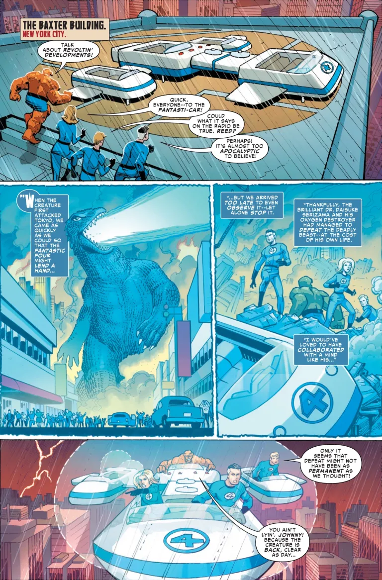 Los kaijus están de moda. Tras invadir los comics de DC, Marvel ha decidido publicar una serie de 6 especiales en los que los principales héroes del Universo Marvel se enfrenta al Rey de los Monstruos de la Toho. El primero de estos especiales es Godzilla vs. Fantastic Four, un comic escrito por Ryan North con dibujo de gran John Romita Jr., con entintado de Scott Hanna y color de Marcio Menyz.