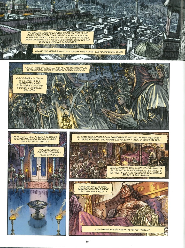 Para la adaptación de este relato de Howard al comic de la edición de Glénat, el guionista Sylvain Runberg plantea una narración con extensísimos bocadillos de texto que han hecho que tardara bastante en leerme el comic completamente. La historia se sitúa en un ubicación fronteriza con múltiples naciones y complejas relaciones político – militares, y se agradece la información. La prosa de Runberg añade lirismo a la historia, aunque no se si coge elementos literales de los textos originales. Además, me gusta la complejidad de personajes secundarios como la ayudante de Yasmina que se enamora de un hechicero al que convence para intentar gobernar ellos la nación. Con la cantidad de personajes y ejércitos enfrentados, me parece que esta historia de Howard es de las más interesantes y complejas que he leído en mucho tiempo.