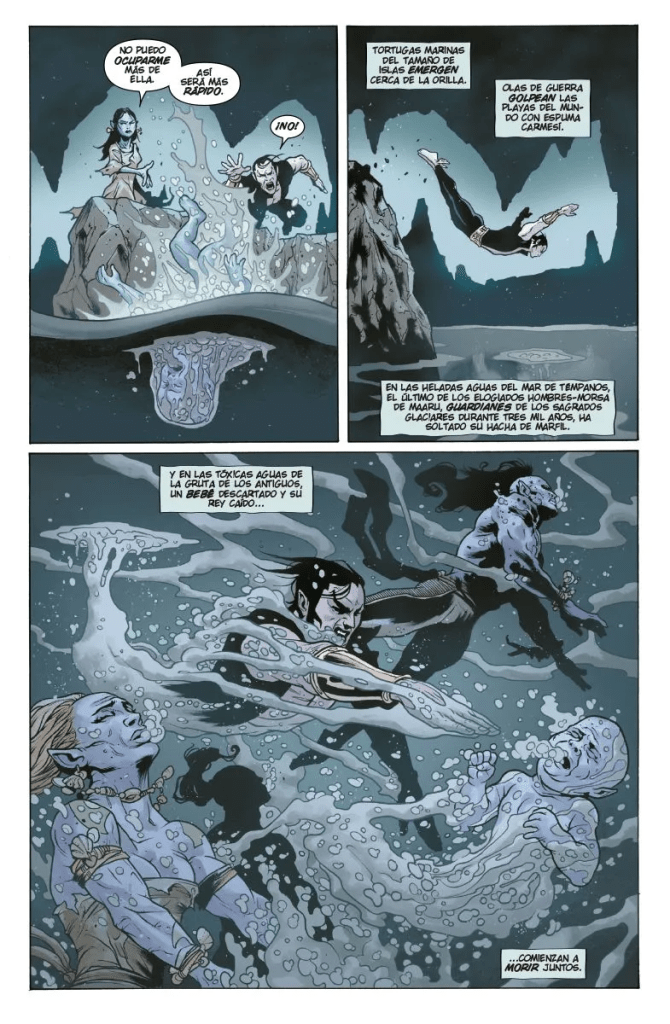 Aaron ha planteado un relato épico que podría decirse que enlaza con las historias mitológicas. Los textos del escritor se recrean con la gran cantidad de lugares, seres y culturas submarinas, creando cuadros de texto super recargados que funcionan en el contexto de esta historia mítica y super épica. Ver a Namor enfrentarse solo contra los 7 ejércitos de los pretendientes al tronos tiene una épica al nivel del Abismo de Helm, con el añadido de plantear una lucha en la que no quiere matar a nadie. Leyendo la historia en su conjunto, creo que Aaron ha realizado un trabajo increíble.