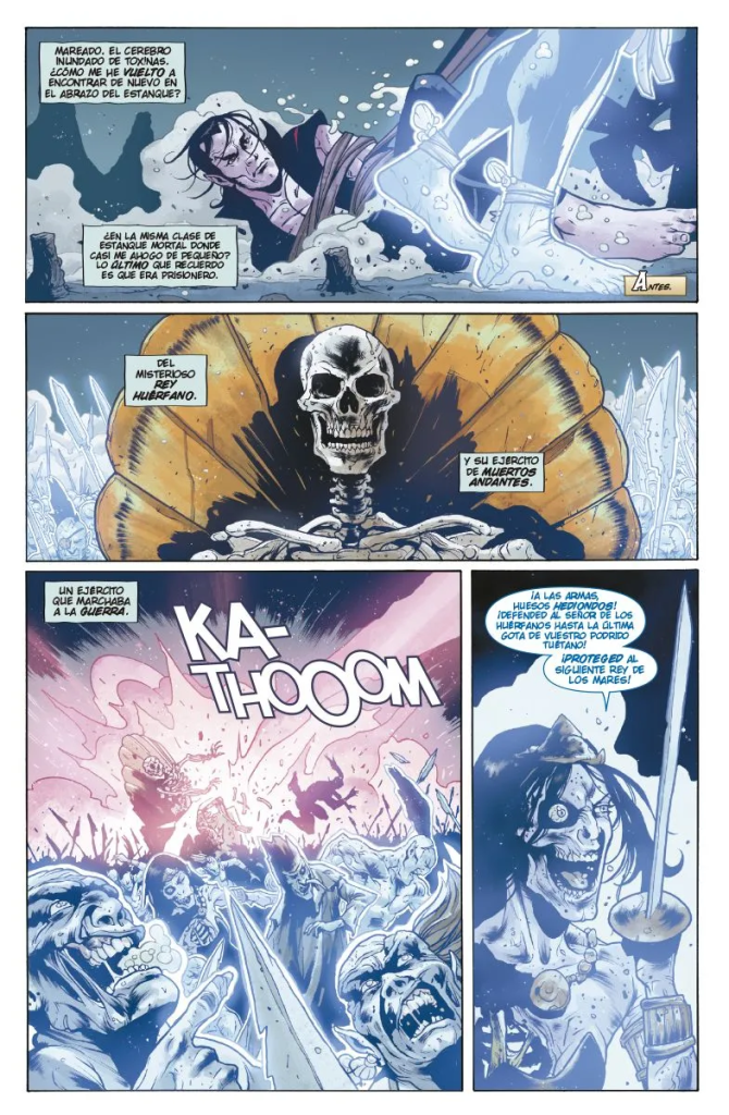 En los últimos años, Marvel está usando a Jason Aaron para cambiar el statu-quo de personajes clásicos de la casa. Lo hizo con Punisher, con un comic cuyo objetivo editorial de retirar de la circulación a Frank Castle era vergonzoso, pero que Aaron se las apañó para entregar un comic super entretenido. En el caso de Namor, la clave de la historia era convertir a Namor en el defensor del mundo submarino desligándolo a los conceptos de «monarquía» o «realeza» que hasta ahora le han acompañado. Un empeño en Namor para el que Jason Aaron vuelve a aprobar con nota.