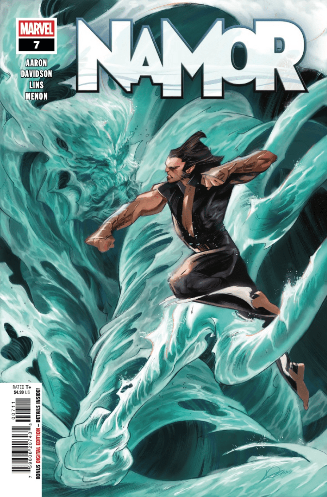 El dibujo de Paul Davidson, que se encarga de la parte del presente, me ha gustado muchísimo más que el de Alex Lins, que dibuja los momentos de flashback y una parte del epílogo. El trabajo de Davidson tiene una personalidad muy potente y triunfa con la creación de los seres que pueblan los 7 reinos submarinos. También me ha gustado la forma en que plantea la épica y el elemento mitológico que tiene la historia de Aaron, ofreciendo unas páginas super espectaculares. Lins sin embargo tiene un cierto feeling a Silver Age que funciona bien en el contexto de que la parte del origen de Namor, pero que flojea por la falta de detalle que aporta a los personajes. Globalmente, aunque un dibujante me ha gustado mucho más que el otro, termino el comic bastante satisfecho del apartado gráfico. Destacar además el color de Neeraj Menon y las potentes portadas de Alexander Lozano para esta serie. Portadas que acompañan la reseña y me parece que ayudan a transmitir la idea de historia mitológica.