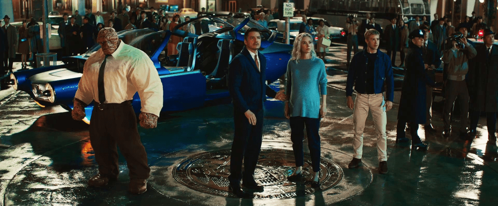 Luego hay una sensación teatral en muchos momentos de la película que me ha resultado inesperada. Y no siempre positiva. Repito que la dinámica familiar me gusta mucho. Pero al mismo tiempo, el 90% del metraje son los 4F en pantalla hablando entre ellos no necesariamente haciendo nada con sus poderes. Por eso es complicado valorar el trabajo del resto de actores, es que casi ni aparecen. Los sets retrofuturistas me gustan, pero cuando aparece el set de televisión por segunda vez en la película me dio sensación que sobraba. Al igual que la tercera vez que la Cosa pasa por la Calle Yancy, o todas las escenas en el comedor de la casa de Reed y Sue pensando lo que van a hacer a continuación. Esto se suma al ritmo y la sensación episódica de la película y a un climax que no es todo lo espectacular que me hubiera gustado. Todo ello provocó que la película no haya hecho click. Me ha gustado mucho en muchos momentos, pero no siempre.