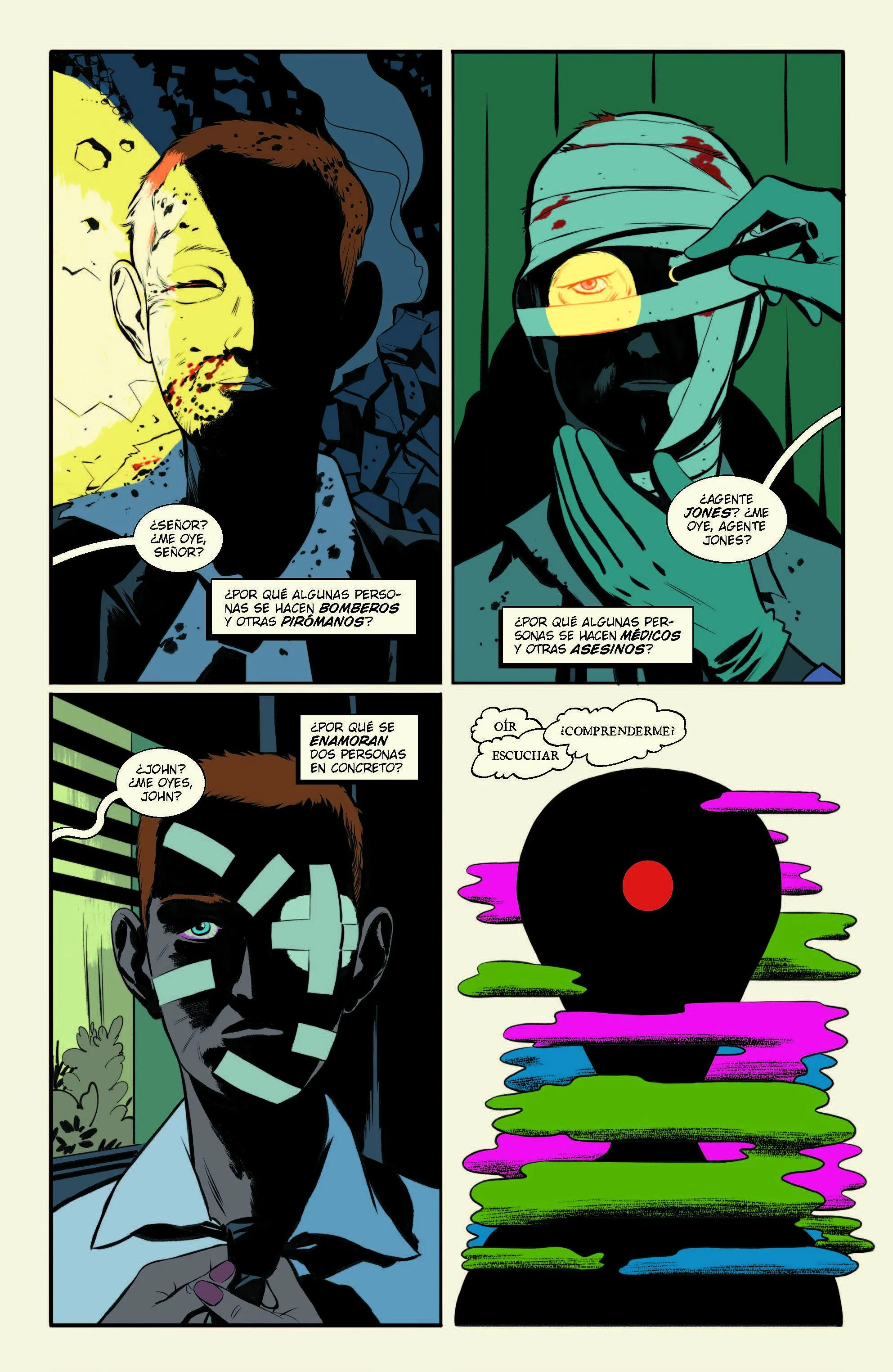 La historia de Camp creo que está bien, pero sobre todo tiene la virtud de saber echarse al lado para que Javier Rodríguez se luzca con una narrativa antológica que está llamada a marcar un antes y un después en DC Comics. La forma en que Rodríguez plantea la telepatía en imágenes como colores que saturan la mente de John Johns, me parece una barbaridad. En el comic se incluye una entrevista de Lidia Castillo a Javier Rodríguez que me ha parecido una maravilla, al explicar la forma en que planteó la serie y la narrativa de la serie. Y que confirma lo difícil que es dibujar de la forma teóricamente minimalista como lo hace Rodríguez, al dibujar sólo lo esencial para contar la historia de la mejor manera posible transmitiendo los sentimientos y sensaciones justos al lector para que podamos interpretar la escena de la forma correcta.