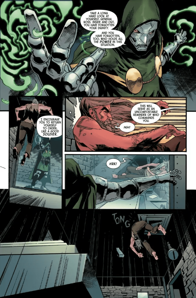 En el especial The Incredible Hulk 800, publicado en el número 150 de la numeración de Panini tuvimos una historia corta en la que el General Ross era hecho prisionero por Victor von Doom. Este número continúa directamente, y la primera sorpresa positiva es descubrir que Benjamin Percy ha convertido el primer arco de esta colección en una recreación de La gran evasión, con un General Ross intentando escapar del cautiverio de Muerte.