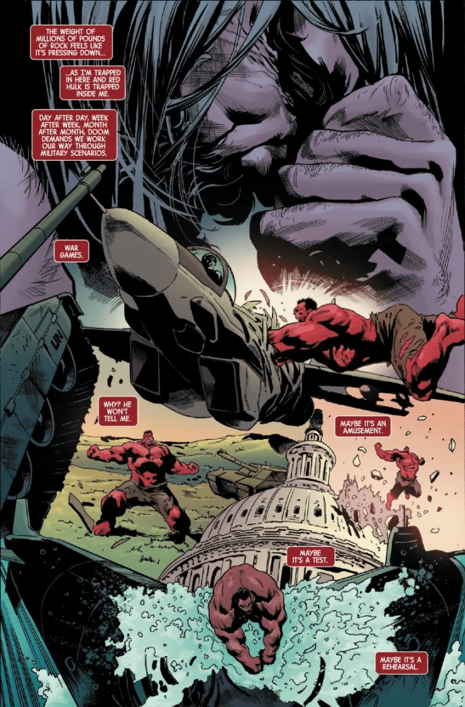 ¡La furia del Hulk Rojo se desata en el contexto de Un mundo bajo Muerte! «Trueno» Ross se encuentra prisionero del Doctor Muerte… y no se encuentra solo. Militares brillantes, mentes criminales y destacados políticos se encuentran encarcelados en un complejo en el que se trabaja para ayudar al plan de dominación mundial del villano. Pero el Hulk Rojo tiene otros planes.