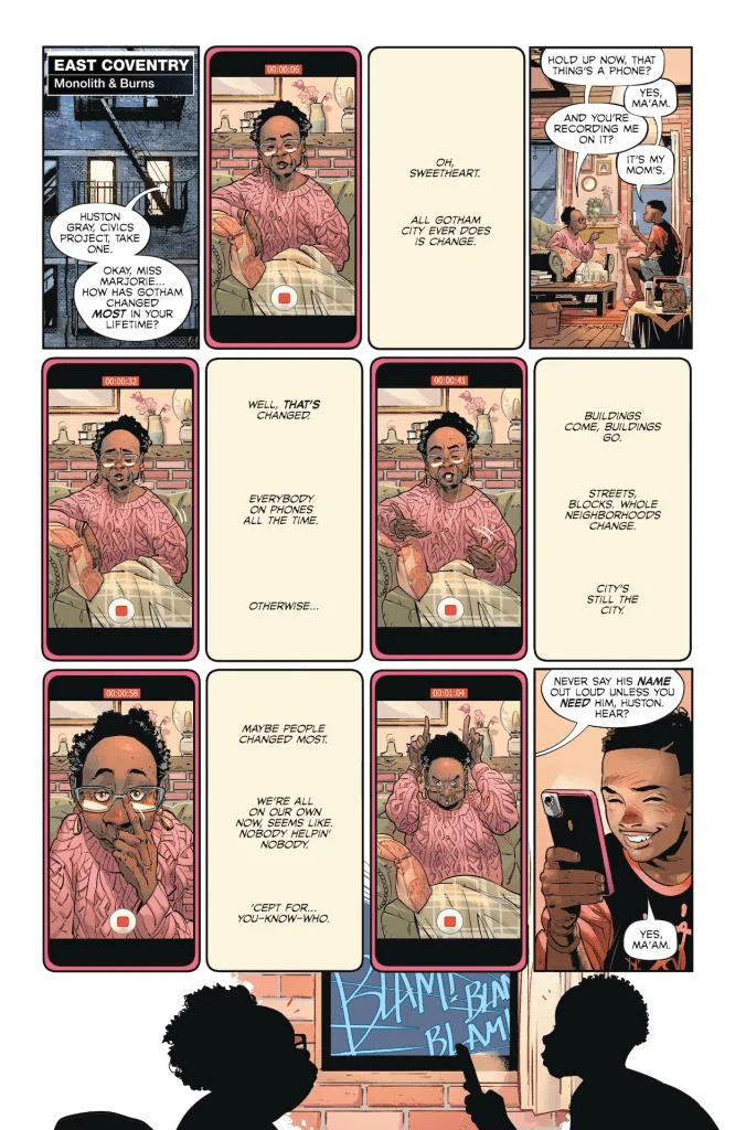 Como he comentado en los meses previos, la historia de Fraction está chula, pero el principal valor del comic viene del espectacular dibujo de Jorge Jiménez. Por ejemplo, podéis ver en las imágenes del comic que ha incorporado a esta reseña cómo Jiménez planea una página de un nieto grabando a su abuela con el móvil, y lo que podría ser algo aburrido y sin chispa se convierte en una página llena de personalidad que da gusto leer. Y como eso, con todo. Cualquier imagen de Batman dibujada por Jiménez se convierte en mi imagen favorita de forma instantánea, con el plus que no son splash-pages molonas sin más, sino que son imágenes que ayudan a la narrativa general.