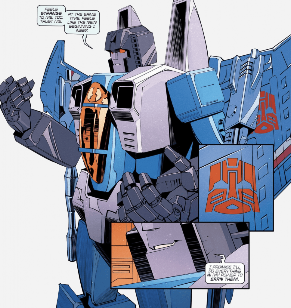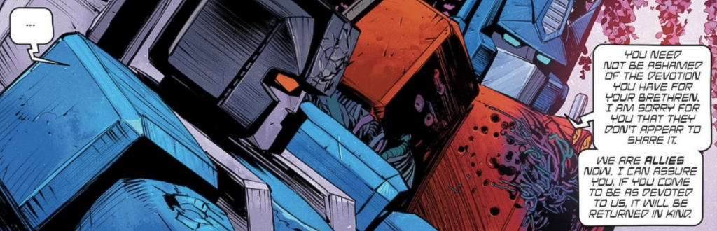 Robert Kirkman y Dan Mora siguen con paso firme estableciendo las que serán las líneas narrativas más importantes de la colección en los próximos meses. En este número 27 hemos asistido a un montón de situaciones super importantes. Quizá la más emocionante sea la conversación de Optimus Prime y el nuevo autobot Thundercracker, tras desertar de los decepticons. Esta conversación me parece profunda e importante, porque aunque Thundercracker creía en la causa general de los Decepticons y aceptaba la violencia como un medio necesario para alcanzar un fin necesario, se siente incómodo con el nivel de crueldad y masacre innecesaria. Hasta el punto de abandonar la causa decepticon. Ver a Thundercracker con el símbolo autobot es uno de los momentazos del comic.