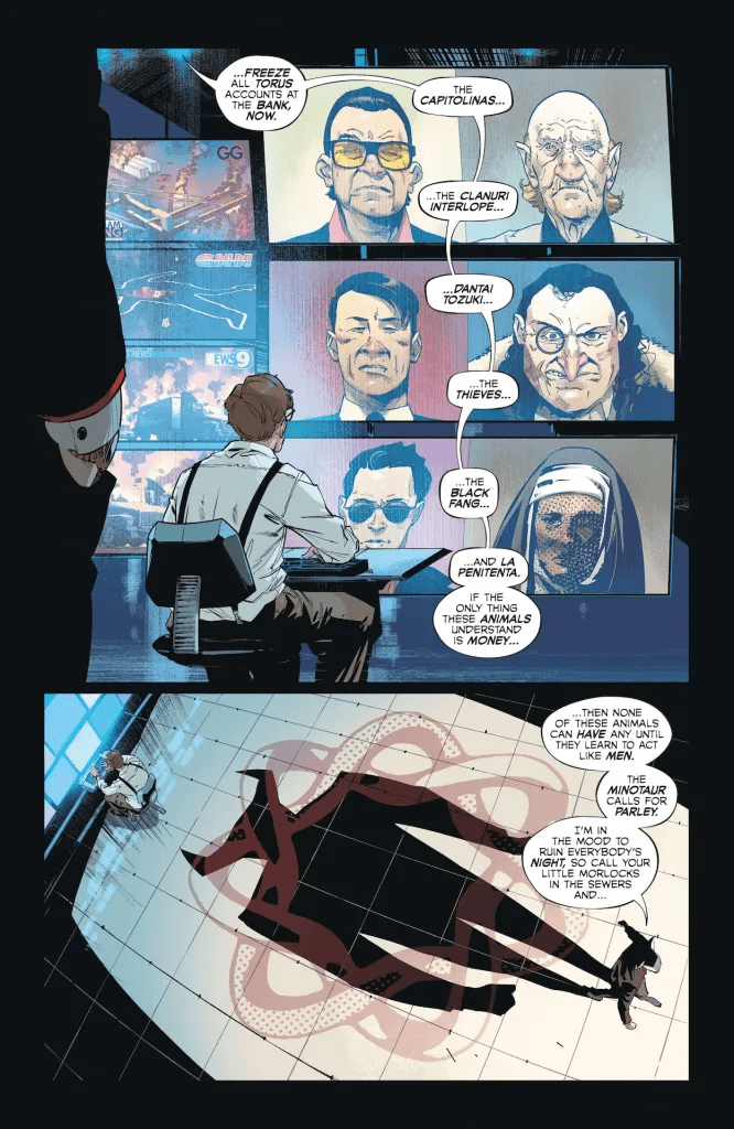En lo referido a la historia de Fraction, la portada es ilustrativa de lo que nos vamos a encontrar. El nuevo poder en la sombra de Gotham es Minotauro, el líder de la nueva organización Torus. Minotauro es el nuevo banquero de las bandas criminales y ha conseguido que todas trabajen coordinadamente maximizando así los beneficios para todos. Fraction aprovecha para presentarnos a las 6 bandas criminales que operan en Gotham, siendo el Pingüino el único conocido.