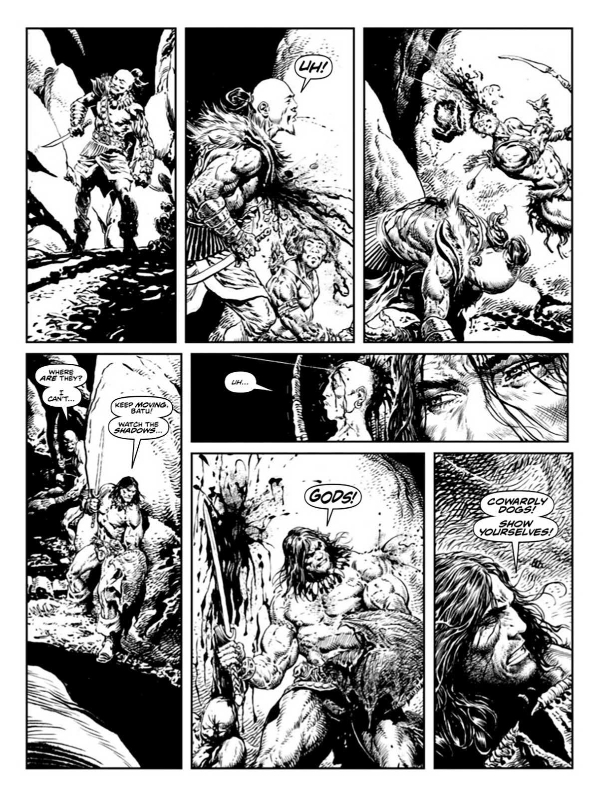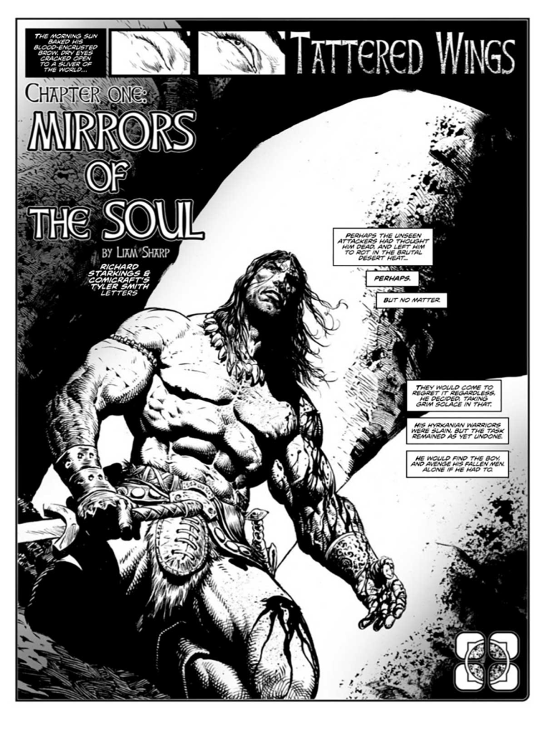 He tenido que leer este comic dos veces antes de escribir esta reseña. Tras leerlo la primera vez, la sensación que me dejó fue que el dibujo de Sharp era alucinante, pero una historia de realidades alternativas que provocaba tener a dos Conans de mundos diferentes enfrentados era algo raro que no acababa de casar con lo que se espera de una historia de Conan. Tras leerlo una segunda vez, sigo creyendo que la idea de Sharp de hacer que Anzu-Kur, Señor de Ekur-Gal, sea una versión alternativa de Conan es algo super gratuito que no me acaba de funcionar. Pero quitando eso, tengo que aplaudir la capacidad de plantear en 50 páginas una historia con montones de giros y traiciones inesperadas que me ha gustado mucho. Además, el final con la duda de si todo lo que vivió Conan fue real o un sueño si me parece una idea que casa muy bien con los mitos creados por Robert E. Howard. Creo que el Sharp guionista se está poniendo al nivel del Sharp dibujante.
