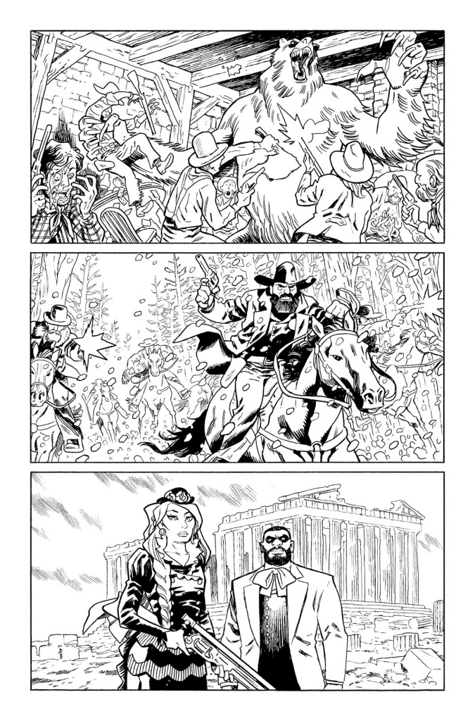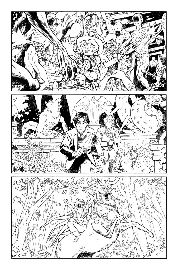 Ver un comic dibujado por Hurtt es un placer, pero el disfrute no es completo, ya que en el segundo número Travis Hymel entra en el equipo creativo de la serie entintando los lápices de Hurtt en las últimas 10 páginas de esa grapa. En el tercer número Hymel entinta los lápices de Hurtt en su totalidad. Y diría que no solo entinta, sino que Hurtt sólo aboceta estas páginas porque no llegaba a tiempo, y ha sido Hymel el que ha entregado el trabajo acabado. Lo digo porque la diferencia entre unas páginas y otras es llamativa. De hecho, es tan llamativa como para que sea una cosa que no me ha gustado y quiera comentarlo en este reseña.