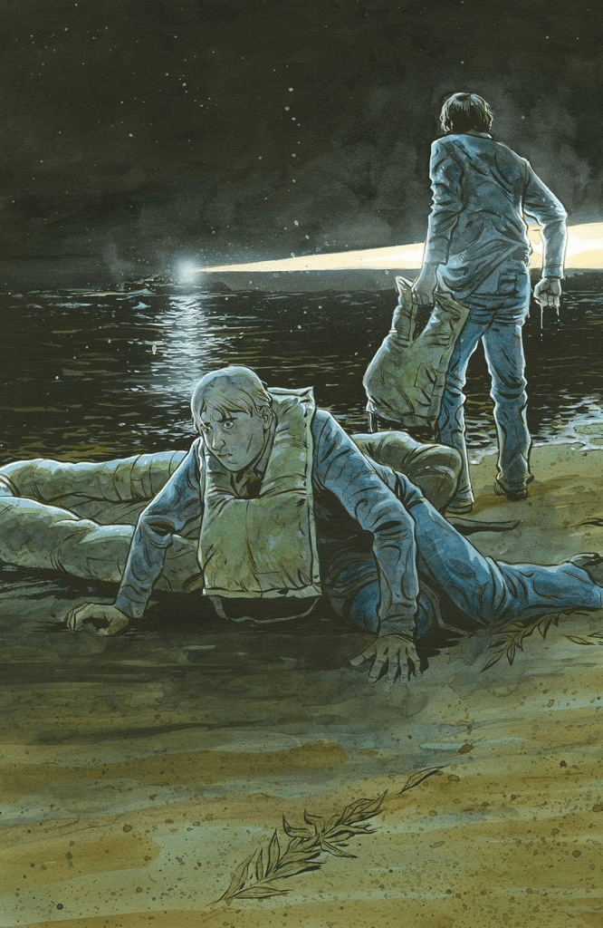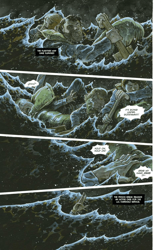 Conocí a Tyler Crook gracias a Harrow County, el comic de terror rural creado junto a Cullen Bunn. Crook siempre me ha parecido un dibujante fantástico, con un estilo pintado como a acuarela cuya principal virtud es su capacidad de transmitir la atmósfera que necesita cada historia en la que colabora. Además, pensando de nuevo en Harrow County, Crook parece brillar aún más en historias ambientadas en el pasado, de forma que su estilo artístico ayuda a trasladarnos a una época anterior a la nuestra. Que este comic esté inspirado en hechos reales que sucedieron en 1962, al menos en lo referido a la fuga de Alcatraz, ayudaba a que todo invitara a pensar que Crook podía estar en su salsa en este comic.