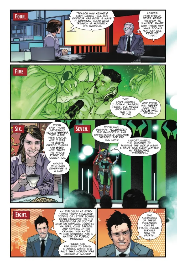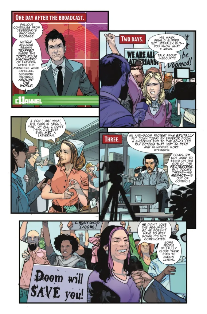En este número tenemos en las dos primeras páginas ejemplos de cómo se toma la sociedad la revelación que Muerte es malvado, que sólo busca el poder y la dominación sobre todo lo demás. Y aquí North muestra uno de los problemas del comic, al querer hacer una asociación de lo que pasa en este comic con la actualidad social y política de los Estados Unidos y la polarización de su sociedad con dos grupos enfrentados que ven cualquier cosa desde puntos de vista opuestos. Así, mientras unas personas se dan cuenta que Muerte es malvado, incluido J. Jonah Jameson, otras personas opinan que les da igual todo porque a ellos les va bien y no conocen a ningún latveriano. Otra persona tiene claro que Muerte no tiene que dimitir porque le ganó el debate a Reed Richards tras torturarle. Como si eso fuera bueno. Y esto podría parecer una idea genial si no fuera que es demasiado poco, demasiado intrascendente. Porque en realidad, es que todo nos da igual. Y nos da igual porque no hemos llegado a conocer la sociedad de Muerte, por lo que esto no conecta emocionalmente.