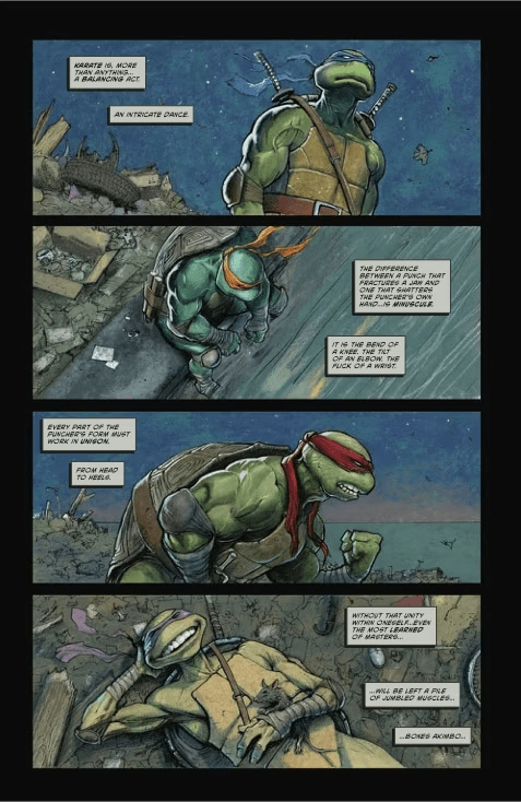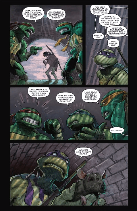 El trabajo de caracterización de Aaron ha sido mayúsculo, mostrando que son mucho más que Ninjas cuya única diferencia son las armas que llevan. Me ha flipado descubrir la psicología de Leonardo, Michelangelo, Donatello y Raphael. Y viendo lo diferentes que son entre si, por eso resulta tan satisfactorio cuando por fin aceptan esas diferencias y se unen para volver a ser el equipo que siempre fueron.
