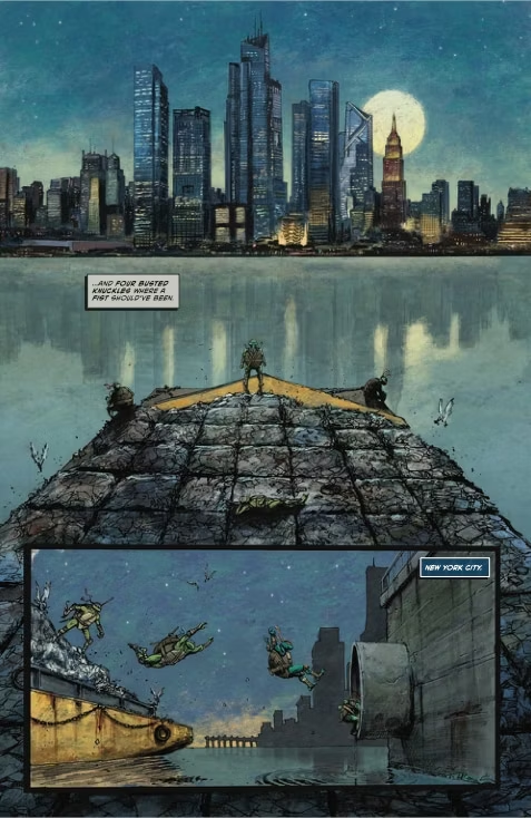 Y es que el comic es ante todo un medio visual. La historia puede estar bien, pero son las imágenes las que tienen que contar la historia y conseguir que conectemos con los personajes y sus problemas. Ferreyra se ha salido en estos 7 números de las Tortugas Ninja. Ya no es que su narrativa sea increíble y las caracterizaciones perfectas, hasta el punto de poder diferenciar a las 4 tortugas entre ellas. Es que en cada grapa Ferreyra planteaba una solución visual extraordinaria para cada uno de los desafíos narrativos que le planteaba Aaron.
