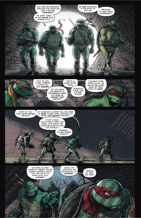 ¡El famoso artista Juan Ferreyra (Batman & Robin, Green Arrow) debuta como nuevo dibujante de TMNT! Las Tortugas están de vuelta, huyendo y peleándose entre ellas. Recorriendo una ciudad de Nueva York que solía ser su hogar, pero que ahora es un territorio hostil, los cuatro hermanos intentan que todo vuelva a la normalidad, pero Donatello está profundamente marcado tras su cautiverio. ¿Podrán los cuatro hermanos unirse? ¿O se encontrarán a merced del Clan Foot?