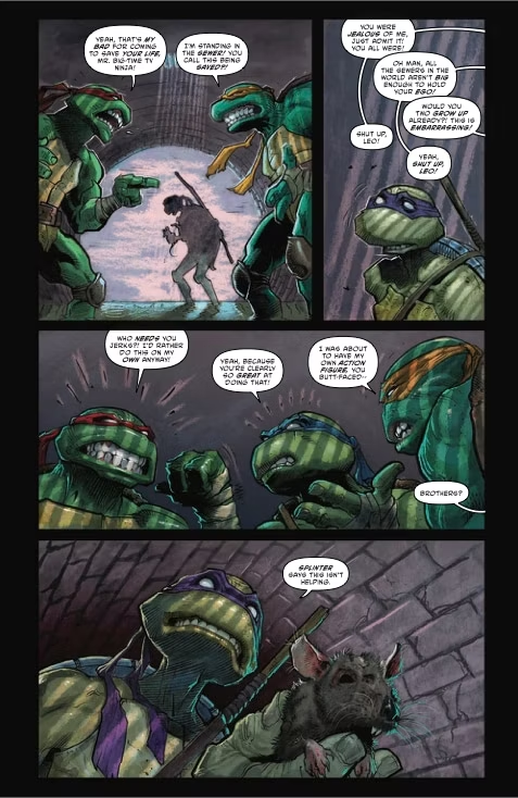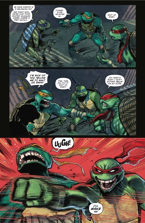 La etapa de Jason Aaron en las Tortugas Ninja (TMNT) empezó de forma poco habitual, al encontrarse los hermanos separados y viviendo aventuras en solitario. Finalmente las 4 tortugas volvieron a reunirse para enfrentarse a la amenaza que les atacó cuando se encontraban en su momento más débil. En esta segunda etapa los hermanos se han vuelto a reunir, pero los viejos agravios siguen a flor de piel, por lo que antes de derrotar a nadie tendrán que resolver sus problemas.