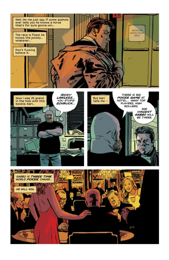 La historia principal está protagonizada por Ricky Lawless, y es un poco una chorrada, al ver un robo que está a punto de irse al garete porque Ricky se olvida del encargo al pasarse con las drogas y el alcohol. Este comic sirve para presentar un noir de perdedores, que fue lo que siempre estuvo en el ADN de criminal. La historia es bastante divertida, tiene el toque justo de amoralidad y sexualidad explícita, y el giro final deja claro el tono que entiendo que Brubaker quiere que tenga la serie de televisión. Empezando por tener protagonistas malas personas capaces de hacer cosas terribles por nada.
