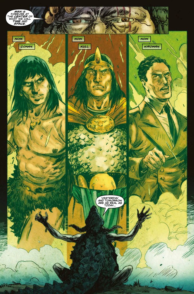 Para Conan: Scourge of the Serpent, Jim Zub parece que ha aprendido algunas de las lecciones de Battle of the Black Stone, pero su ambición narrativa no ha disminuido ni un ápice. Zub plantea una historia protagonizada tan sólo por tres héroes, cuatro en realidad, al seguir los pasos con siglos de diferencia de Conan, el profesor John Kirowan y el Rey Kull y su aliado el guerrero picto Brule. El elemento que más me ha alucinado de la historia de Zub es que las tres historias adaptan tres historias originales de Robert E. Howard, creando el hilo conductor que las conecta de una forma magistral.