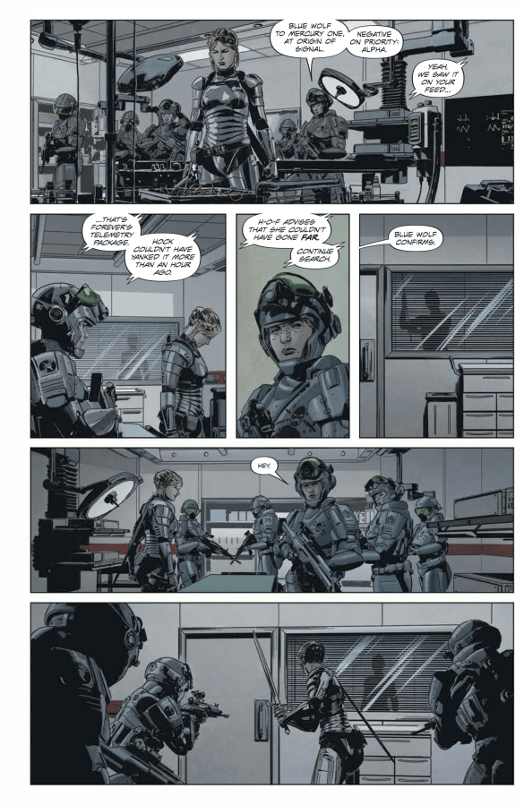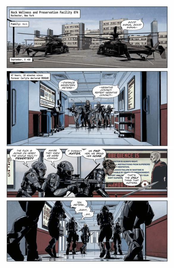 Aunque el mundo de Lazarus tiene muchísima geopolítica, me encanta que Rucka haya decidido que la historia se cuente siempre a pie de calle, con Forever como nuestros ojos sobre el terreno. Y con los Carlyle en el lado opusto de la ecuación. Eso es lo que ha conseguido que la conexión emocional funcionara desde el principio, y que sea uno de los grandes aciertos del comic. Además, pensando en el tiempo transcurrido entre volúmenes, y entre la salida de los diferentes números de esta miniserie, Rucka hace un uso estupendo de las elipsis al final de casi todas las grapas, resaltando el paso del tiempo mientras las hermanas siguen con su fuga.