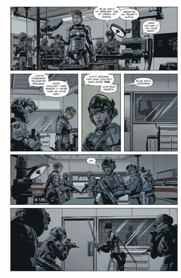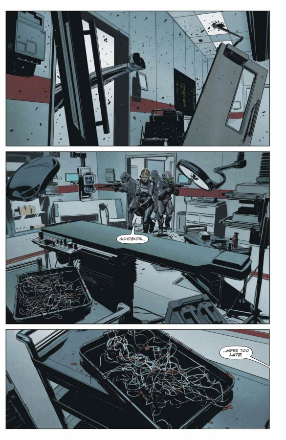 Aunque el mundo de Lazarus tiene muchísima geopolítica, me encanta que Rucka haya decidido que la historia se cuente siempre a pie de calle, con Forever como nuestros ojos sobre el terreno. Y con los Carlyle en el lado opusto de la ecuación. Eso es lo que ha conseguido que la conexión emocional funcionara desde el principio, y que sea uno de los grandes aciertos del comic. Además, pensando en el tiempo transcurrido entre volúmenes, y entre la salida de los diferentes números de esta miniserie, Rucka hace un uso estupendo de las elipsis al final de casi todas las grapas, resaltando el paso del tiempo mientras las hermanas siguen con su fuga.
