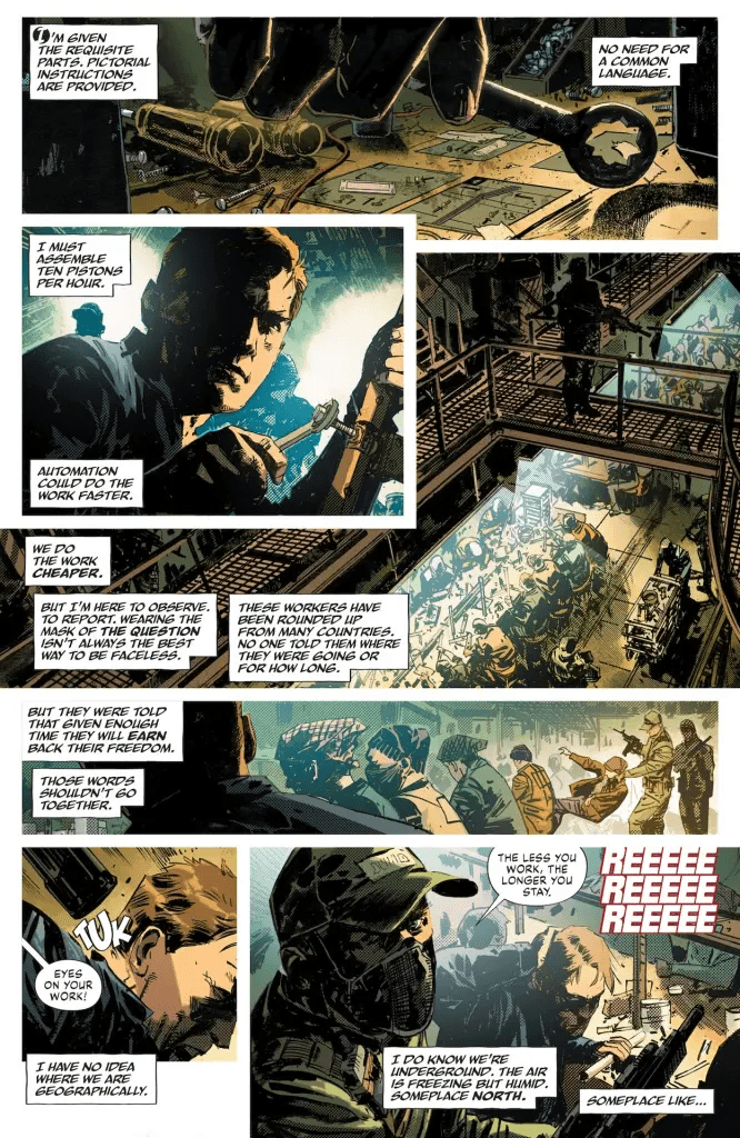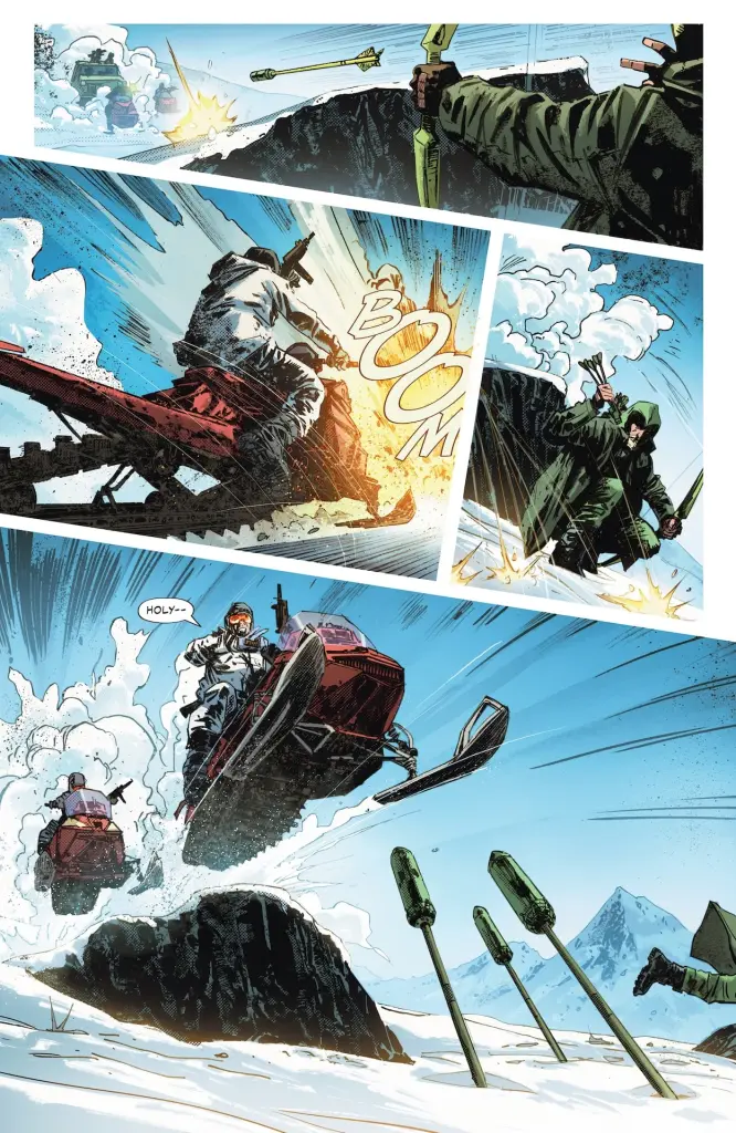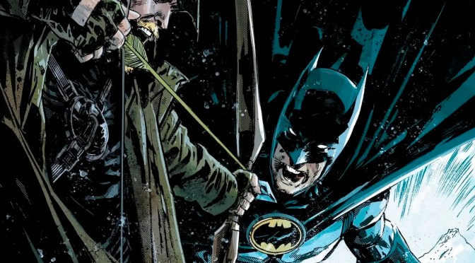 La historia conecta con muchos de los clichés del noir, al seguir a tres protagonistas llegando a una localización desolada por motivos diferentes, pero que acaban siendo el mismo caso. Dentro de la faceta «eficaz» de Hardman, me ha chocado el papel que plantea para Batman, haciendo que sea casi el machaca del villano. Está claro que al ser un comic Black Label, no está en continuidad, y su autor puede plantear lo que mejor le funcione en su historia. Pero por lo leído hasta el momento, la parte de Batman es la más floja del conjunto. que los esbirros de Arcadia disparen a Oliver Queen y él lo vea sin hacer nada es simplemente bochornoso.