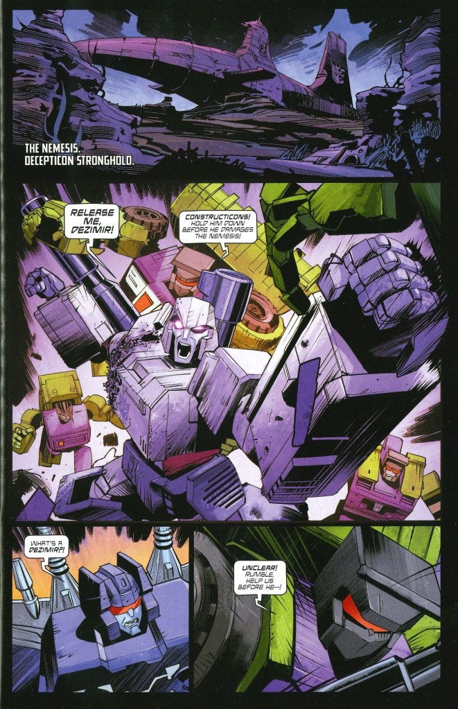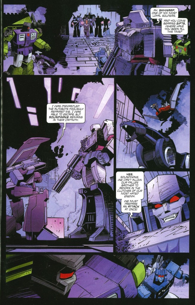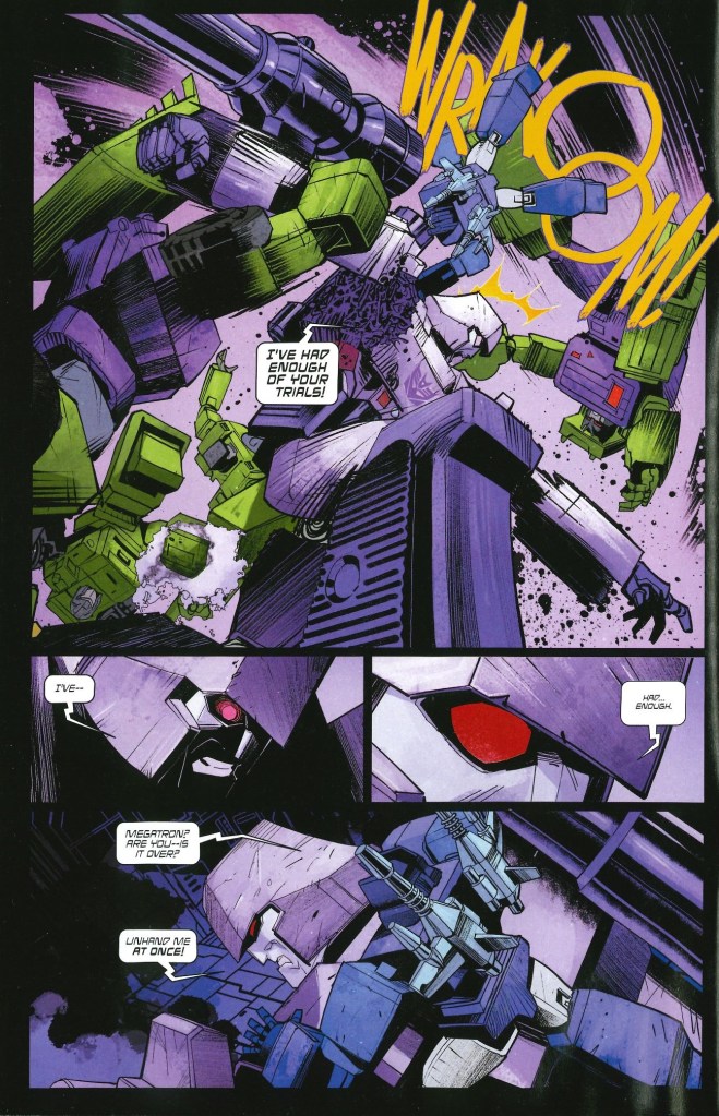 Megatron parece que está viendo visiones o está sufriendo algún tipo de enfermedad. Sin embargo, la llegada de Skywarp, tras ser reparado por los autobots y escapar en el número anterior, provoca que inicie su programación primaria, que es luchar contra los autobots hasta que todos sean destruidos. Esto nos lleva a uno de los mayores shocks de la actual etapa de Transformers dentro del Universo Energon. Por un lado, esta escena es Kirkman en estado puro, pero hay que quitarme el sombrero ante la destrucción, el shock y el dramatismo que Dan Mora consigue imprimir al este momentazo.
