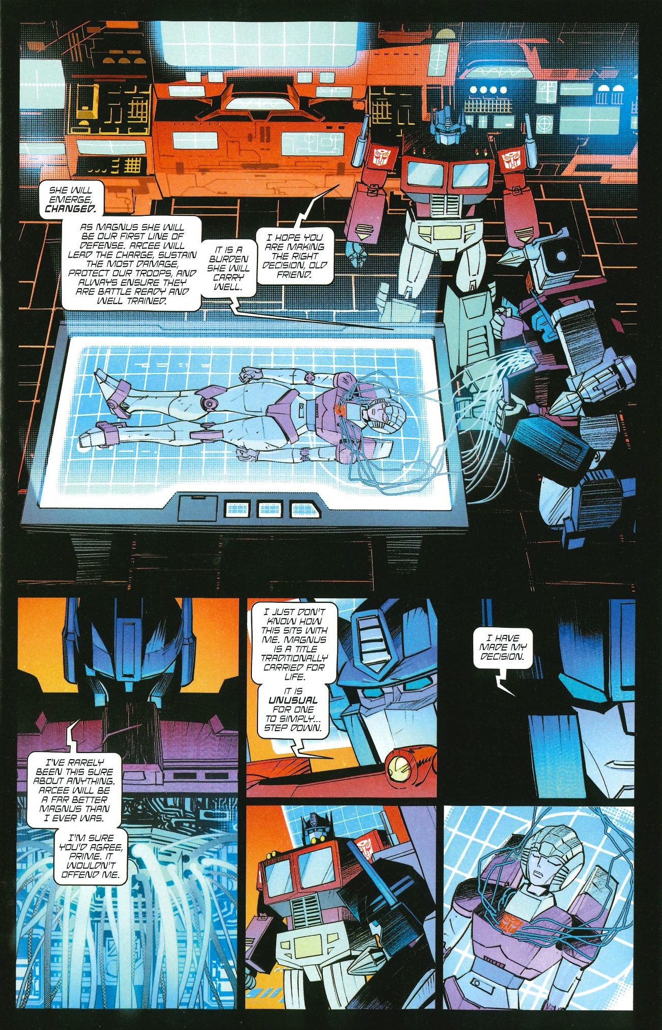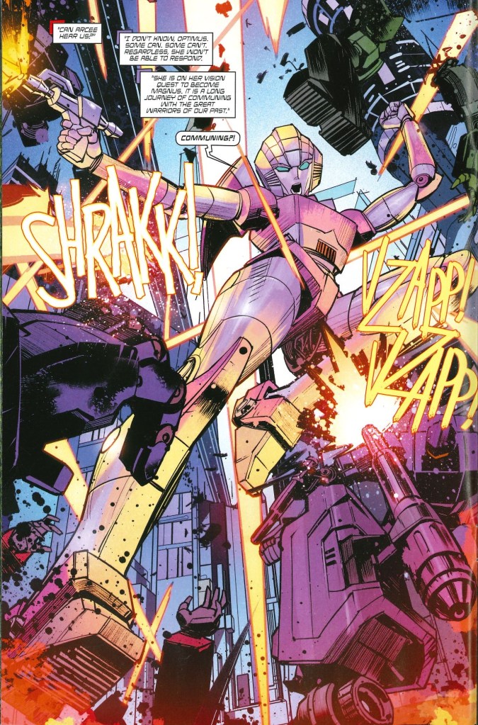 Tras unos meses en los que Robert Kirkman estaba situando las piezas en el nuevo tablero, en este número resulta sorprendente la cantidad de cosas impactantes que suceden en las apenas 20 páginas de esta grapa. El cambio más alucinante es ver a Arcee convertida en la nueva Arcee Magnus, tras querer dejar el puesto un traumatizado Ultra Magnus. Me encanta Arcee y ver el upgrade que tiene en estas páginas, es una pasada. Sobre esto, muchas gracias, también, Dan Mora.
