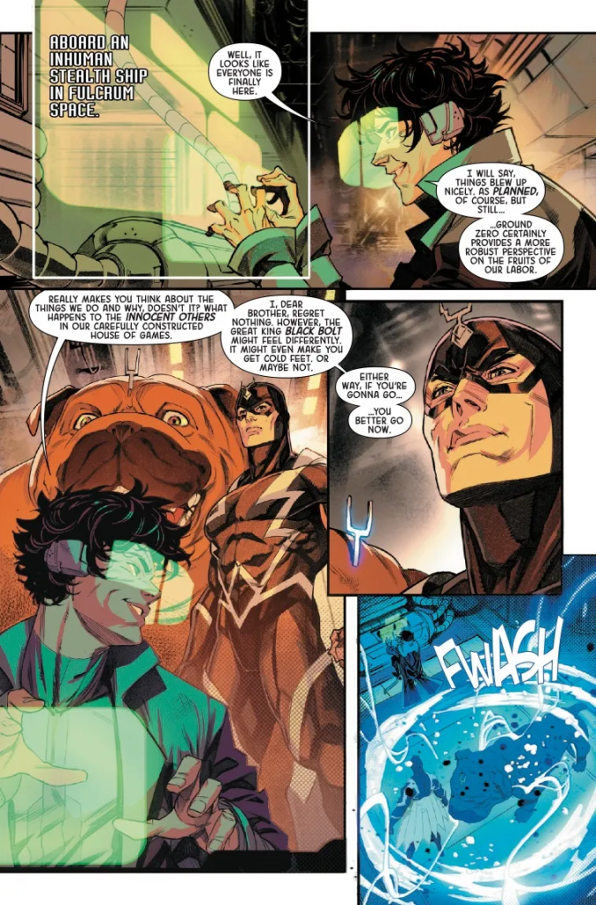 Lo que no soporto de Jonathan Hickman es la falta de coherencia de sus historias y cómo retuerce a los personajes para convertirles en irreconocibles para ajustarlos a su narrativa. Esto ha vuelto a pasar, y me saca de mis casillas. Los Inhumanos, su rey Rayo Negro y Maximus, pero para el caso es lo mismo, han provocado una guerra civil asesinando a líderes de todas las razas y engañando a los Skrulls. Nova y Starlord lo descubren, se lo cuentan a Shuri, ¿y no pasa nada? Starlord dice que no dice nada porque eso afectaría a la recién creada unión, algo absurdo. No me lo creo. Starlord es un cabeza caliente que nunca aceptaría que el asesino de su padre saliera impune. Pero Jonathan Hickman manda, así que Marvel acepta cambiar al personaje para convertirle en un político que lidia con las complejidades de la geopolítica cósmica. Es lamentable. Y partimos de un pecado de base, que es que había que relanzar a los Inhumanos, la forma de hacerlo era secundaria.