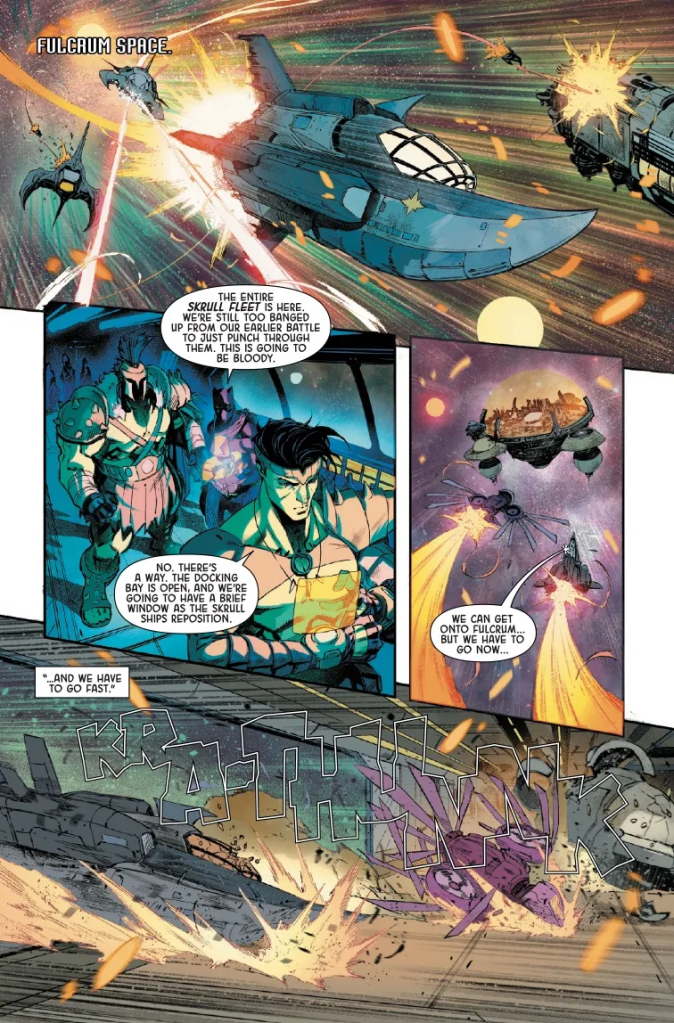 Otro de los problemas del comic viene con el dibujo. Marvel ha decidido dividir el encargo entre Iban Coello y Federico Vicentini, todo ello con color de Federico Blee. Y tengo que decir que me ha gustado el trabajo de Coello, que plantea páginas super dinámicas con una narrativa perfecta. Sin embargo, Vicentini es todo lo contrario, no me ha gustado nada. En concreto, en el climax final del combate contra los skrulls, Vicentini plantea páginas que son melés con decenas de personajes en las que no se entiende lo que está pasando. Tener a decenas de skrulls iguales entre si, y de varios acusadores que también comparten aspecto y son indistinguibles, desde luego no ayuda. Pero su narrativa es terrible, aún estoy intentando descubrir lo que ha pasado. Dentro del desastre de estas páginas, creo que el color de Federico Blee tampoco ayuda, al plantear un color que lo difumina todo y ayuda a la confusión general.