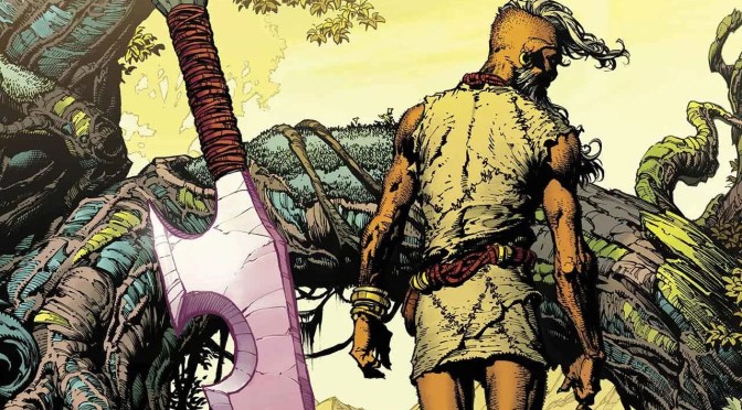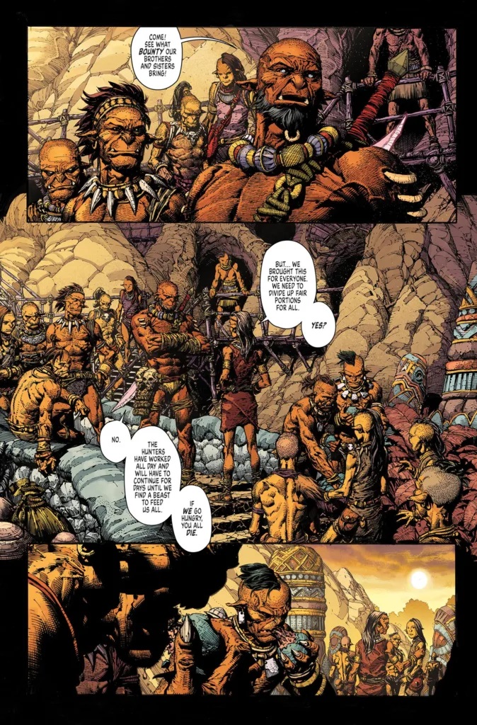 Me encanta el uso de las elipsis que Robert Kirkman plantea en Skinbreaker. Tras el sorprendente e impactante giro del número anterior que cambió la vida en la tribu, las cosas están yendo a peor. Paca, el nuevo líder, ha destruido todas las innovaciones y está destinado a hacer que la gente viva peor al tener que depender de los cazadores. Los avisos de Anok antes del combate sobre que los animales del bosque se estaban acercando demasiado a la tribu y que todos corren peligro no se han tenido en cuenta. Y casi anticipan que la tribu está destinada a ser destruida.