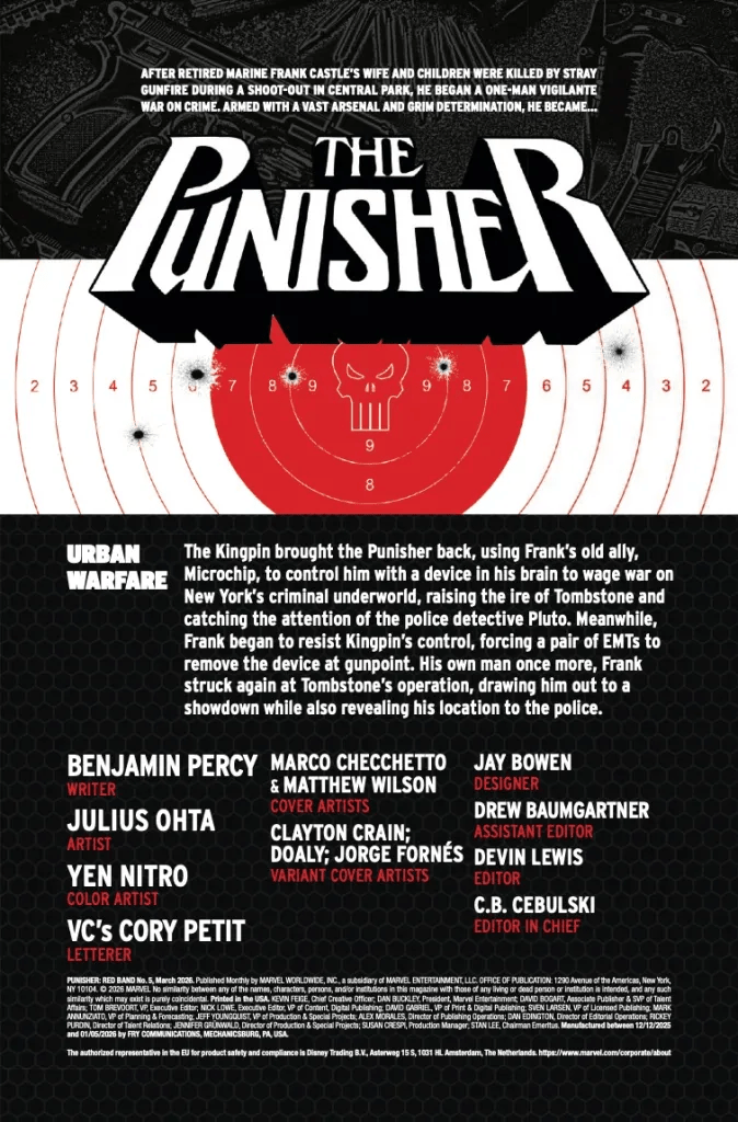 ¡El regreso de Frank Castle al Universo Marvel queda finalmente confirmado, mientras la sinfonía de violencia de los virtuosos BENJAMIN PERCY y JULIUS OHTA alcanza su crescendo asesino!