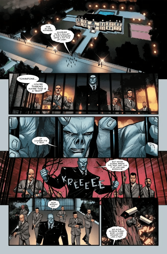 Obviamente al comprar este comic no esperaba que fuera igualarse a la mítica etapa de Garth Ennis, pero no esperaba encontrarme a un incompetente que dispara 20 tiros a alguien para no matarle. Este no es Punisher, que si algo es es quirúrgico, no malgastando 20 balas si puede matar a un enemigo con una apuntada a la cabeza. Por cierto, hablando de esa escena, me parece lamentable que todos sabemos que en el Universo Marvel nadie permanece muerto mucho tiempo. Pero que Punisher haga una punkarrada super fuerte que podría tener importantísimas repercusiones en el universo Marvel y en el mismo comic te muestren que Punisher es un incompetente que no ha matado a alguien a quien disparó 20 veces, es incomprensible.