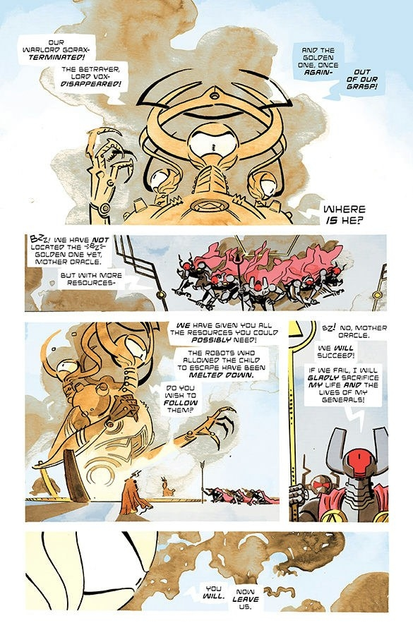 Razel esta ayudando a Jin a controlar sus poderes, pero Kaya tiene claro que busca separarles para usar a Jin para sus propios planes. Y lo cierto es que no tienen ni un segundo de respiro, ya que en su viaje se encontrarán una mina que es una prisión de esclavos que no pueden evitar. Intentar liberar a los esclavos y destruir a los robot que controlan esta prisión va a convertirse en la trama de este quinto volumen. Un volumen centrado como siempre en la potencia visual que Wes Craig imprime en cada página.