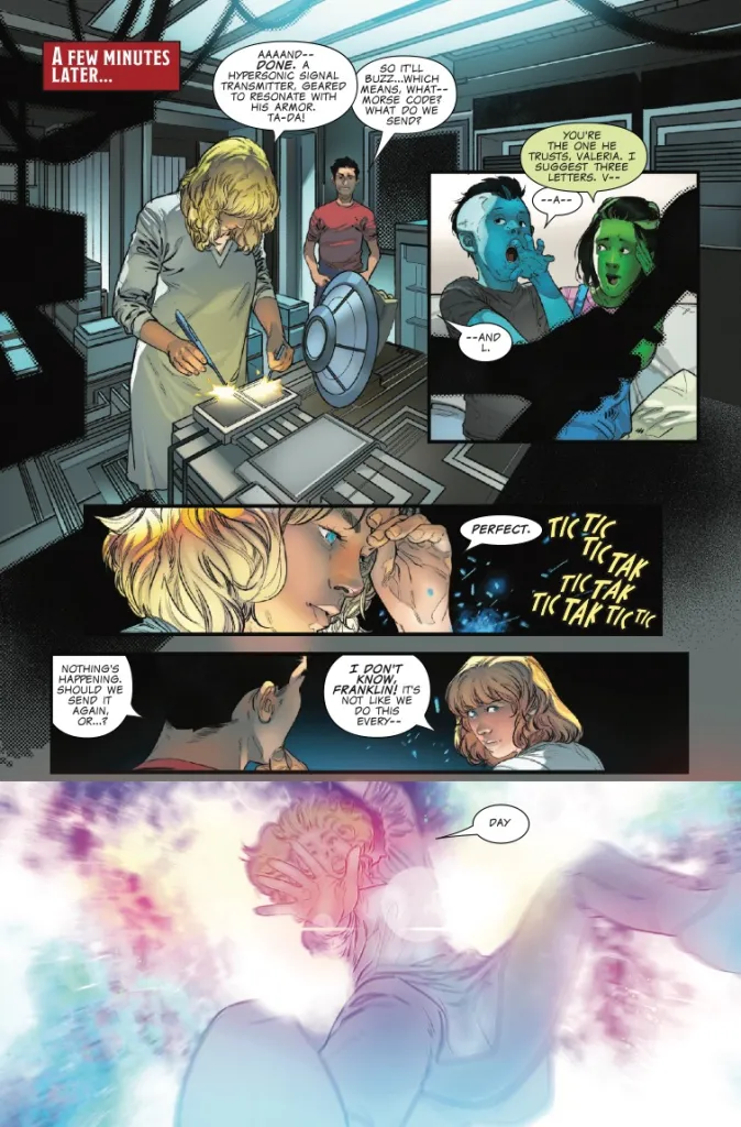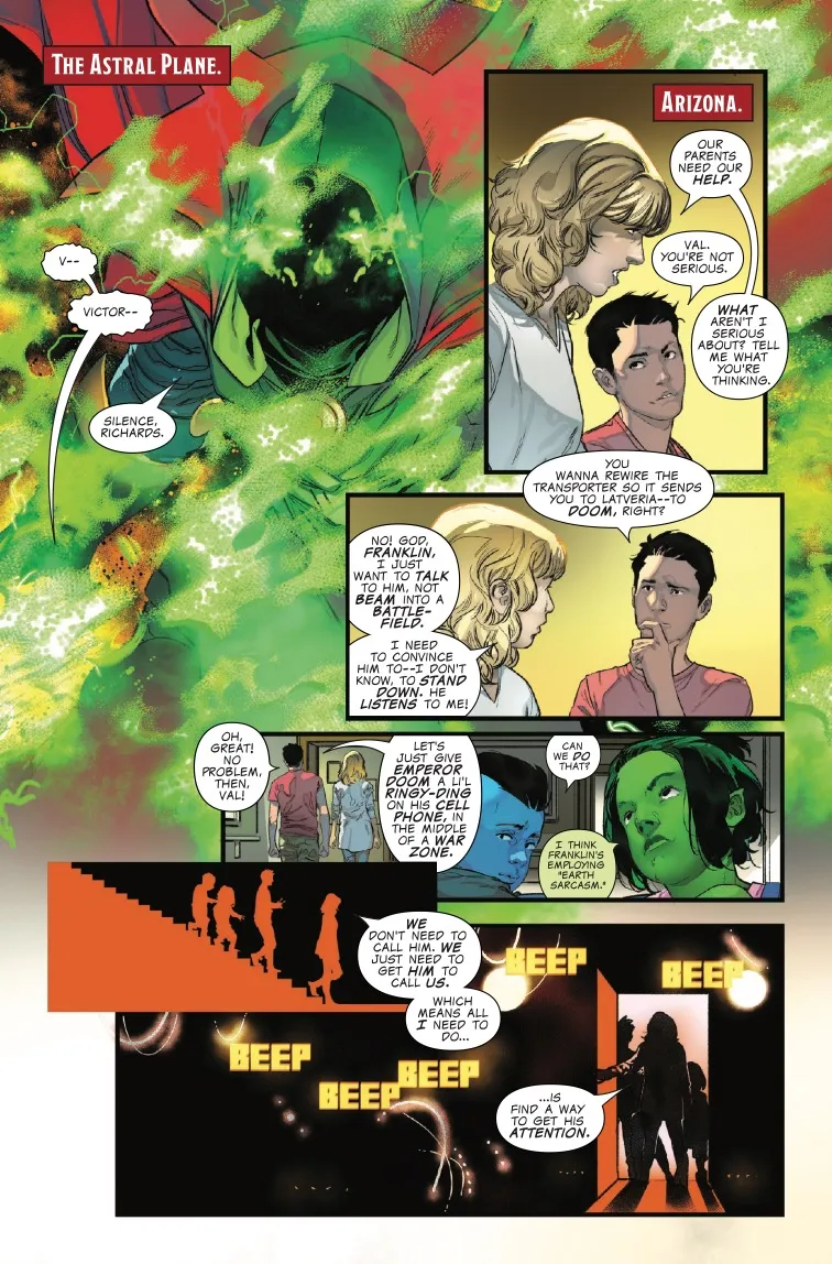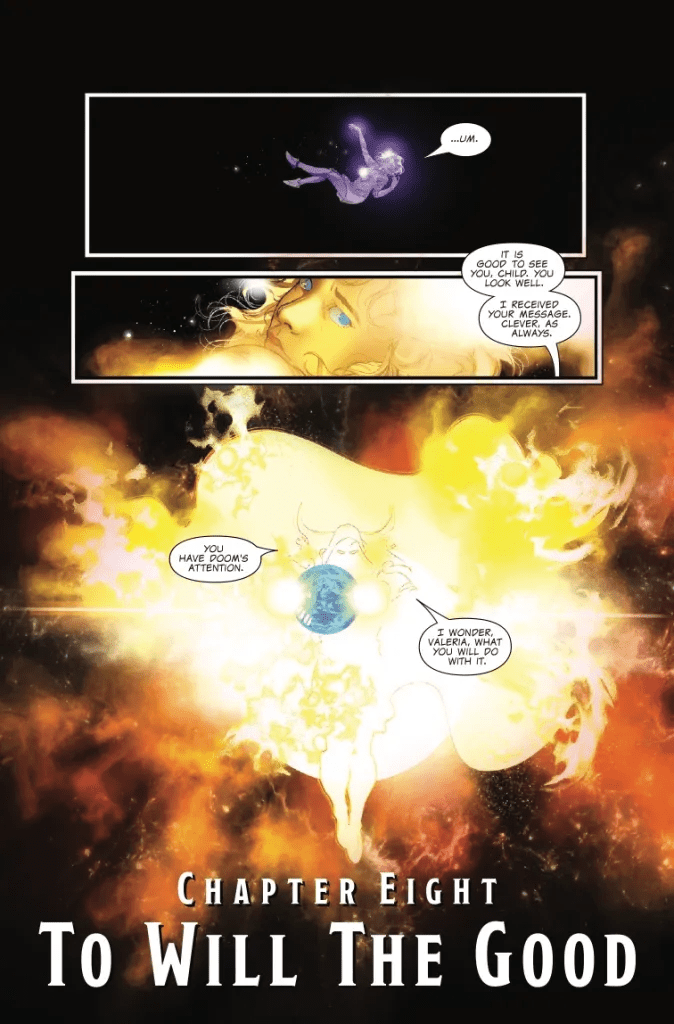 A lo largo de este evento, Ryan North nos había mostrado que la debilidad de Victor Von Muerte era su sobrina Valeria Richards. Sólo ella tiene línea directa con Muerte y es alguien a quien el villano respeta e incluso quiere. Tiene sentido que ella sea la causante de su caída, aunque en realidad es algo que no veremos hasta el último número de la serie que se publicará en Marzo. Junto a los intentos de Valeria para convencer a su tío para que se rinda, este número hace algo muy interesante que es ponernos en el interior de la cabeza de Muerte, siendo él el narrador del comic. Tengo que reconocer que poder ponernos en la piel de Muerte es algo que hace que el comic mejore, frente a la irrelevancia que ha tenido la serie en su conjunto.