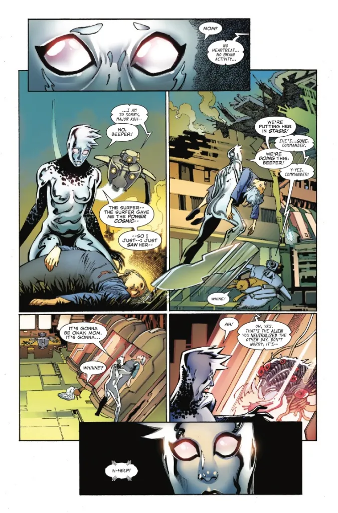 Quizá el principal problema de este cómic es que la idea no era tanto matar a Norrin Radd sino SUSTITUIRLE por una nueva protagonista femenina de nueva creación. Haciéndolo coincidir con la última película de Marvel Studios en la que casualmente también mostraban a una Silver Surfer femenina. Esto ha provocado que Norrin Radd se haya convertido en demasiados momentos a lo largo de esta miniserie en un secundario en su propia serie. Si de alguna manera esperaba un homenaje y/o celebración del personaje ahora que le Iban a matar, estaba terriblemente equivocado.
