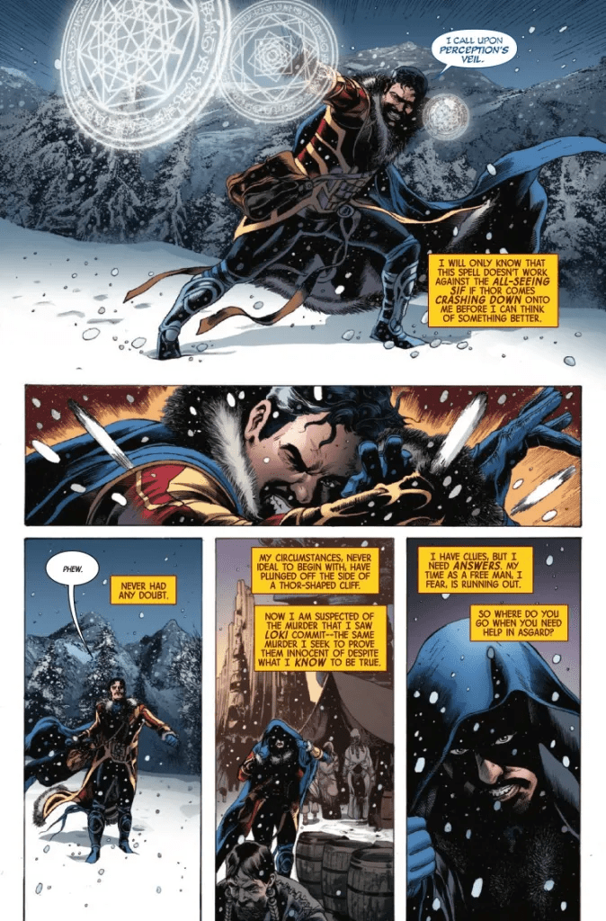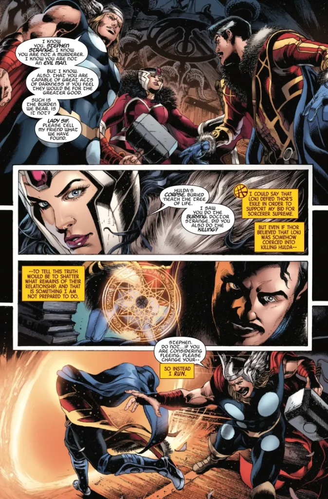 Doctor Extraño de Asgard ha sido una miniserie super entretenida que me ha gustado por varios motivos. En primer lugar, el guionista Derek Landy ha planteado un whodunit a partir del asesinato cometido en Asgard que buscaba incriminar a Stephen y a Loki. La narración para presentar a varios posibles sospechosos me ha parecido muy chula, dentro que en realidad se podría decir que solo había un candidato real, que se ha confirmado como el asesino.