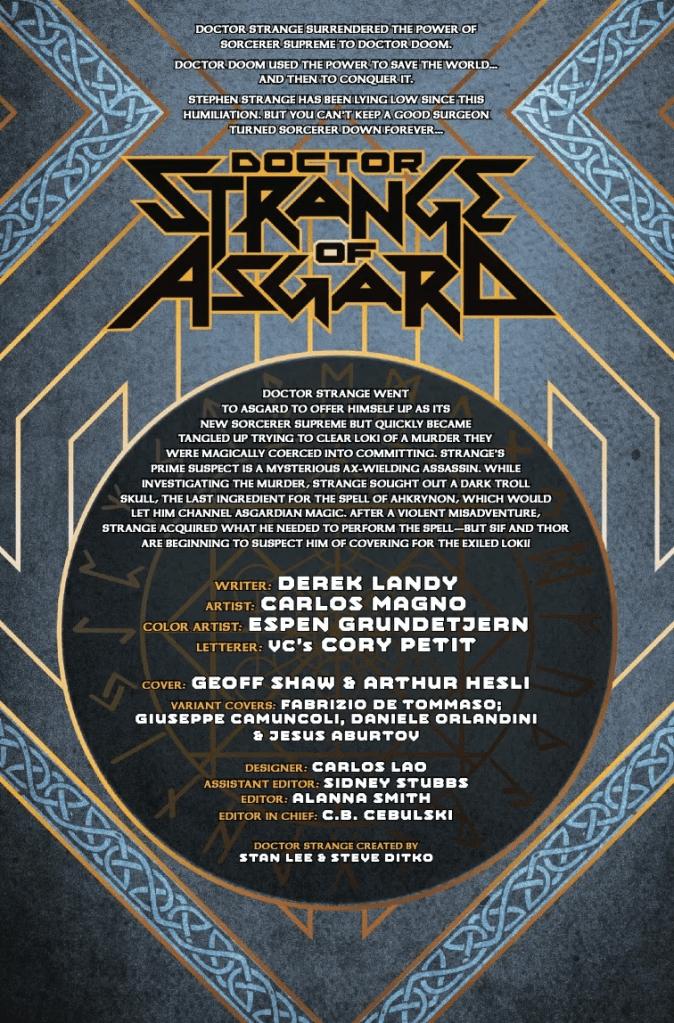 Termina la miniserie Doctor Extraño de Asgard, el cómic de Derek Landy, Carlos Magno y Espen Grundetjern. Y además, el especial Doctor Extraño 450 a cargo de un montón de creativos.