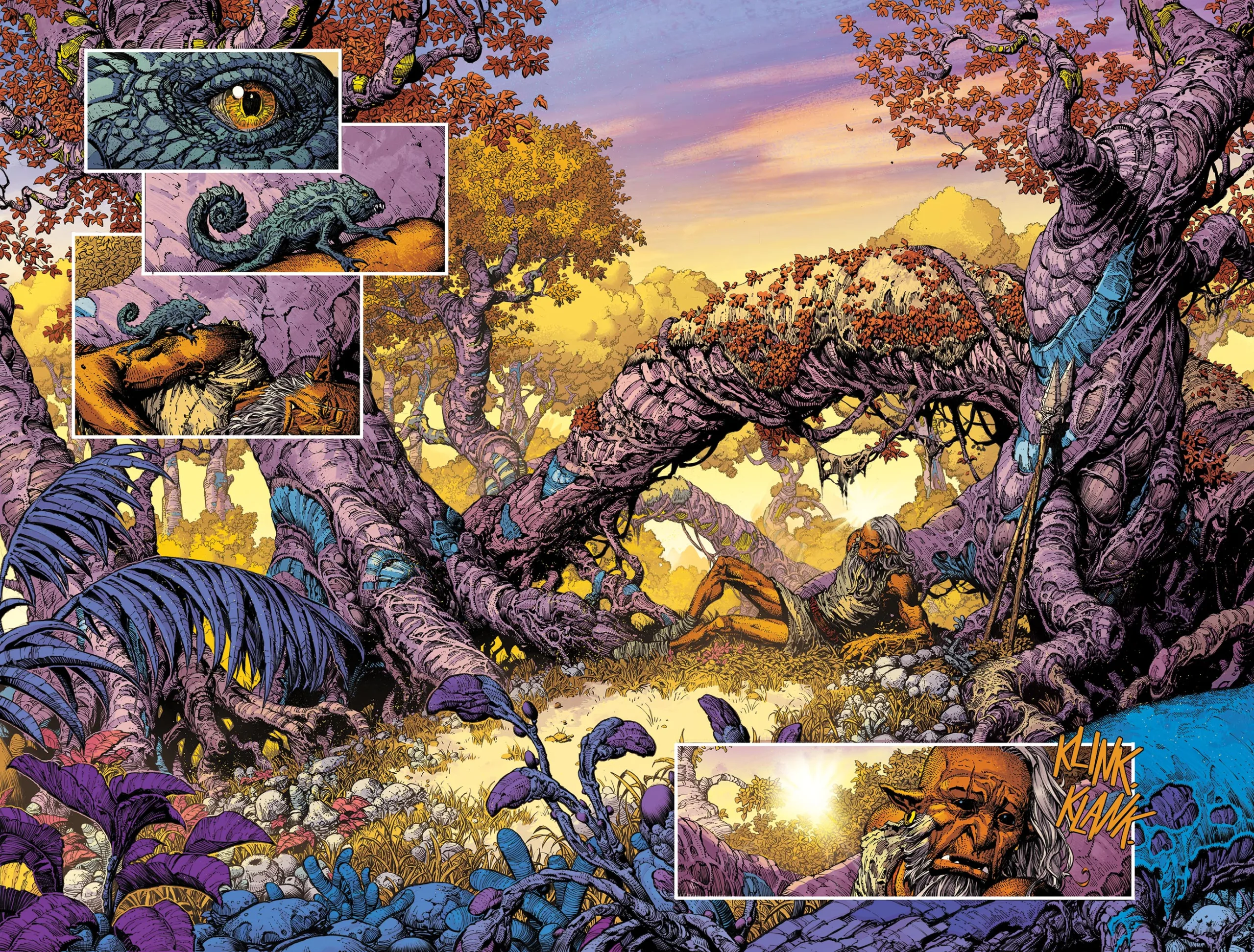 Skinbreaker es un éxito monumental sobre todo por el increíble dibujo de David Finch con el color de Analissa Leoni. Finch ha creado un universo vivo y hace que el lector se sienta dentro de él. La riqueza de flora y fauna es maravilloso, dándonos páginas de detalles infinitos que provocan que me pierda dentro de la imagen. Por ejemplo, la doble splash-page que podréis ver más abajo.