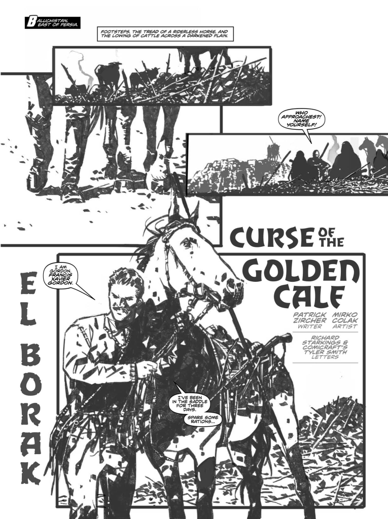 En pero de este número lo tenemos en el dibujo de Mirko Colak para la historia corta de El Borak de Patrick Zircher. Y es que Colak tiene un estilo de «mancha de tinta» que hace complicado que veamos bien lo que está pasando. No he conectado nada con este dibujo, lo que me ha impedido disfrutar de El Borak enfrentado a unos ladrones de ganado con un giro sobrenatural.