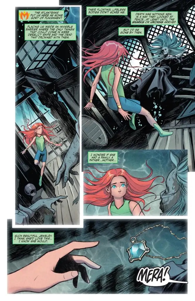 La verdadera naturaleza de Andrina se revela cuando Aquaman se enfrenta al mismísimo Poseidón. Mera tiene una oportunidad de ayudar a su verdadero amor, pero su acción podría destruir al avatar del azul para siempre.