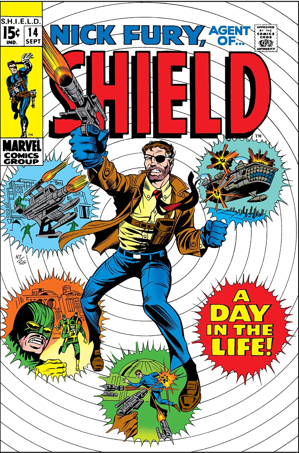 Friedrich y Trimpe repiten en el número 14 en el que Furia es exonerado de sus problemas gracias a descubrir que el psicólogo de SHIELD es también un infiltrado de SHIELD. Villano que por cierto acaba escapando como si nada. Menudo desastre los de recursos humanos, fichan a cualquiera para la organización más secreta del espionaje de los Estados Unidos. En los dibujos, Trimpe intentan a imitar a Steranko en una primera página en la que cada letra del título es una viñeta que muestra lo que se suponen son momentos destacados del comic, quedando resultón para la época. Además, tenemos una viñeta con un foto fotográfico, lo que indica que al menos seguían intentando hacer el comic atractivo para los lectores, si bien el nivel de Trimpe llega hasta donde llega.