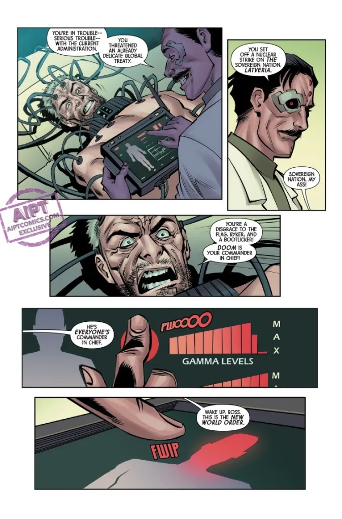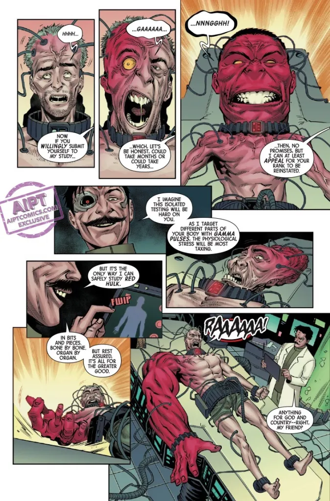 Benjamin Percy planteó dos arcos en su colección Un mundo bajo Muerte Hulk Rojo. En el primero el General Ross con sus aliados Deathlok y el Hombre Máquina intentaban escapar del cautiverio que sufrían en Latveria por parte del Doctor Muerte. Aunque acabaron escapando, Ross fue detenido por el ejército de los Estados Unidos, que fue donde empezó este segundo arco que ahora termina. Con un Ross detenido en una instalación de investigación liderada por el Capitán Simon Riker, a quien vimos en el principio del comic. Riker se ha convertido en un ser mutado llamado War-Wolf y busca crear nuevos soldados super poderosos usando el ADN gamma de Ross.