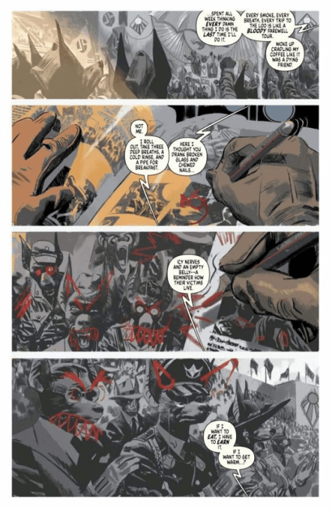 Acuña es un maestro de narrativa secuencial, pero además consigue meternos en la cabeza del protagonista Milton Shaw, que es un «¿héroe?» super interesante. Cuando conocemos su historia y cómo dejó en casa a su mujer embarazada nos transmite un dramatismo poco habitual de leer en un comic mainstream. Cada personaje tiene su propia historia y en muchos casos su propio trauma. Muchos de los cuales pasan porque Milton tiró una bomba a su casa. Sin embargo, el concepto de heroismo se pondrá a prueba cuando Milton reciba ayuda de las personas que menos tendrían que hacerlo.