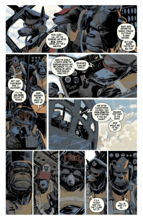 Aunque el comic empieza como una historia bélica con un bombardeo a una factoría enemiga, la historia va a tomar un giro mucho más interesante. Empezando con la conversación que tiene lugar en el bombardero sobre que las dictaduras no nacen de la nada y que muchos soldados del bando enemigo en realidad son gente «inocente» atrapada en un sistema terrible contra la que una simple persona sola no tiene ninguna esperanza de derrotar. Las ideas que Remender plantea en este comic plantean una complejidad inusual en una historia bélica.