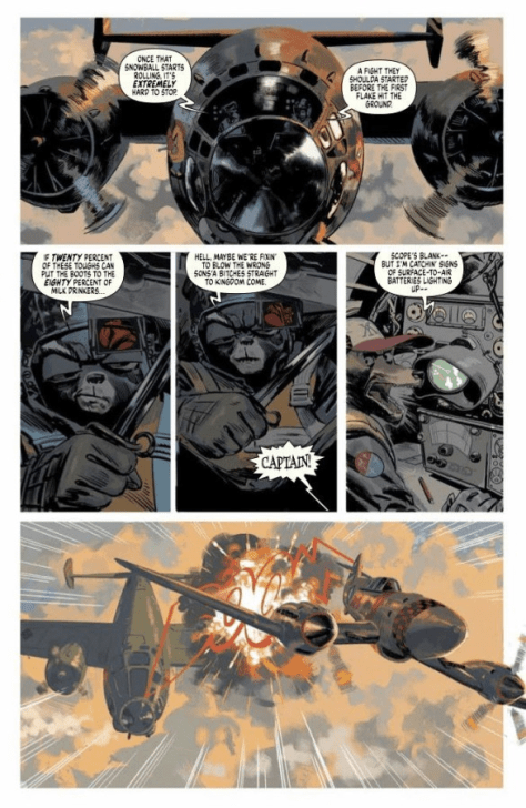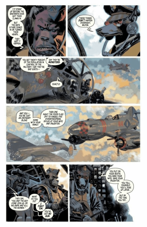 Aparte de la llamativa historia, el éxito de Escape y lo que hace que un buen comic se convierta en uno sobresaliente es el increíble trabajo de Daniel Acuña. Está claro que Acuña no es el primero en hacer historias con animales antropomórficos (¿verdad, Blacksad?), además de ser un recurso que lleva utilizándose desde siempre en animación. Según Remender, la idea de estos animales antropomórficos es que sea más fácil empatizar con todos los personajes, aunque sean los malos. El trabajo de caracterización de Acuña me parece maravilloso, como lo es también el diseño de los aviones, las armas y toda la ambientación de la 2ª Guerra Mundial. Cada una de las imágenes tiene una personalidad bestial y consigue que este mundo te atrape desde la primera viñeta.