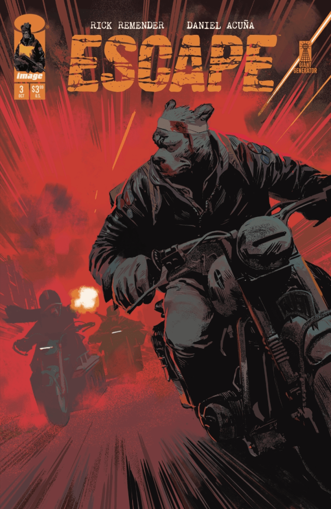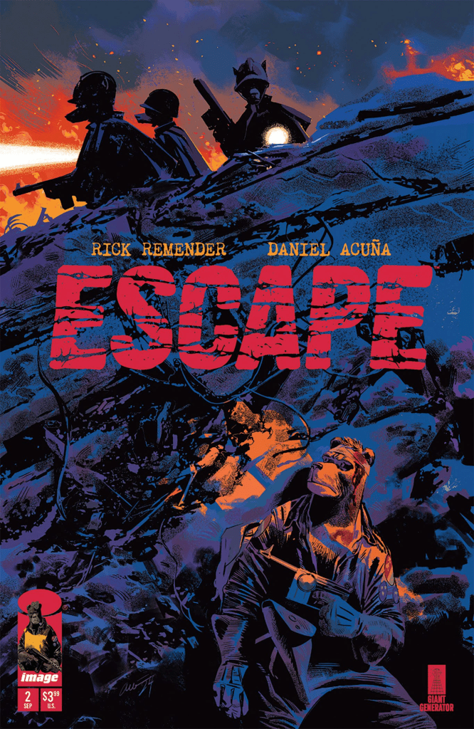 Rick Remender está on-fire en los últimos meses. A través de su sello Iron Generator lleva una temporada espectacular con comics muy variados entre si: La fantasía oscura crítica a las religiones de The Sacrificers con Max Fiumara; la rallada super divertida The Holy Roller, junto a Andy Samberg, Joe Trohman, y Roland Boschi, en el que un superhéroe pelea contra neonazis con bolas de bolos; o The Seasons, el comic junto a Paul Azaceta en el que plantea una historia de fantasía oscura con un feeling a Studio Ghibli. Ahora tenemos Escape con Daniel Acuña, una historia bélica que recuerda a la 2ª Guerra Mundial protagonizada por animales antropomórficos.